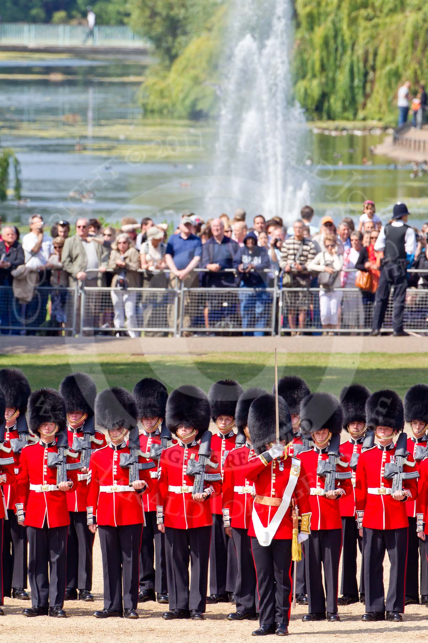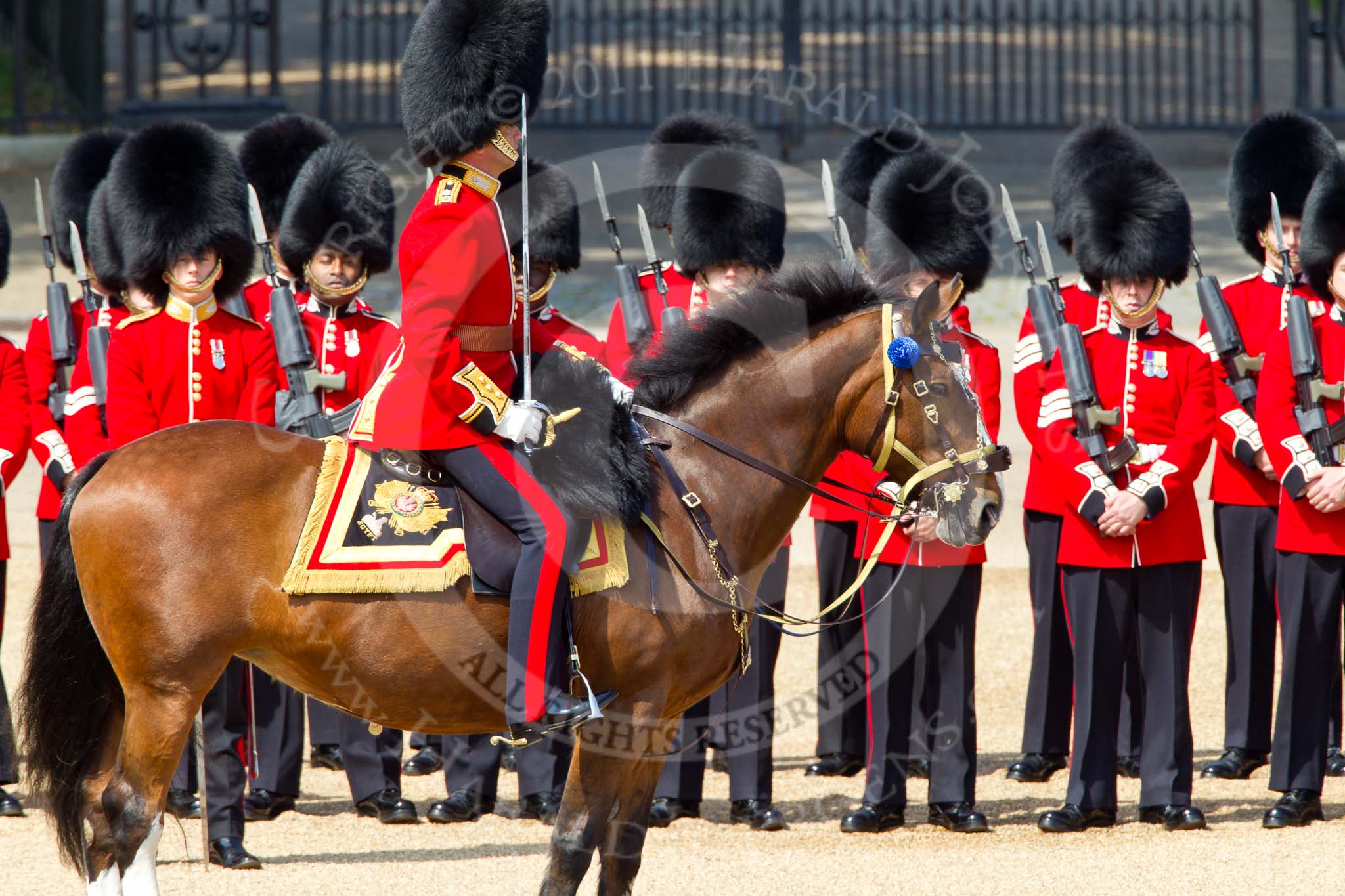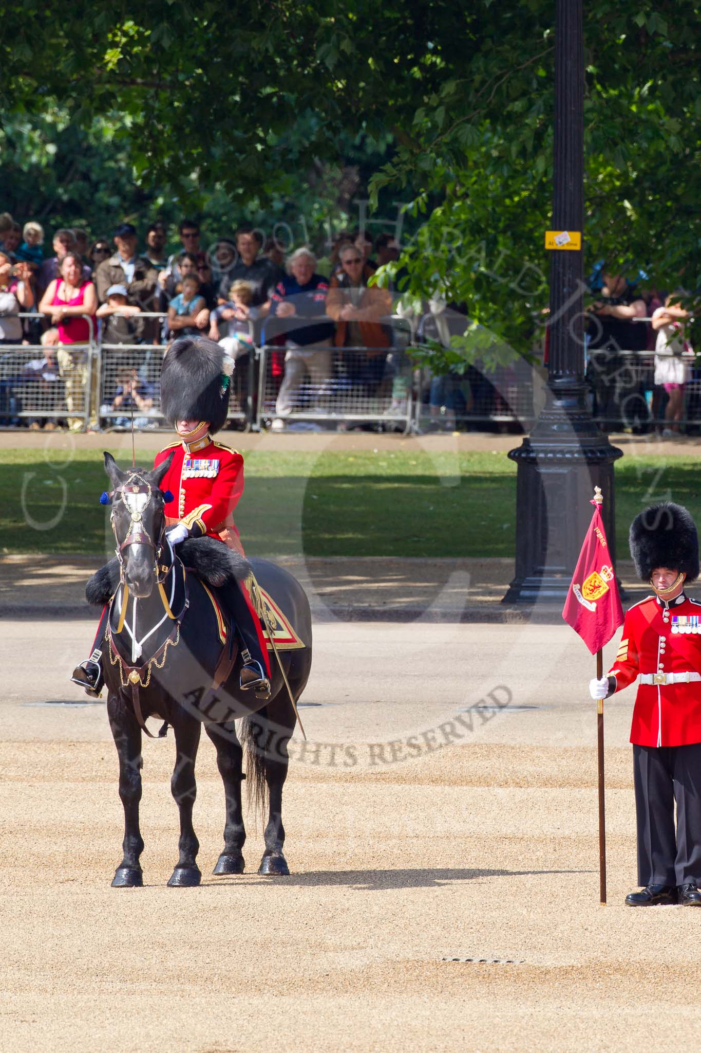 The Colonel's Review 2011: The Major of the Parade, Major Benedict Peter Norman Ramsay, Welsh Guards, in position next to No. 1 Guard, The Escort for the Colour. Behind, spectators watching from St. James's Park.. Horse Guards Parade, Westminster, London SW1, United Kingdom, on 04 June 2011 at 10:42, image #58