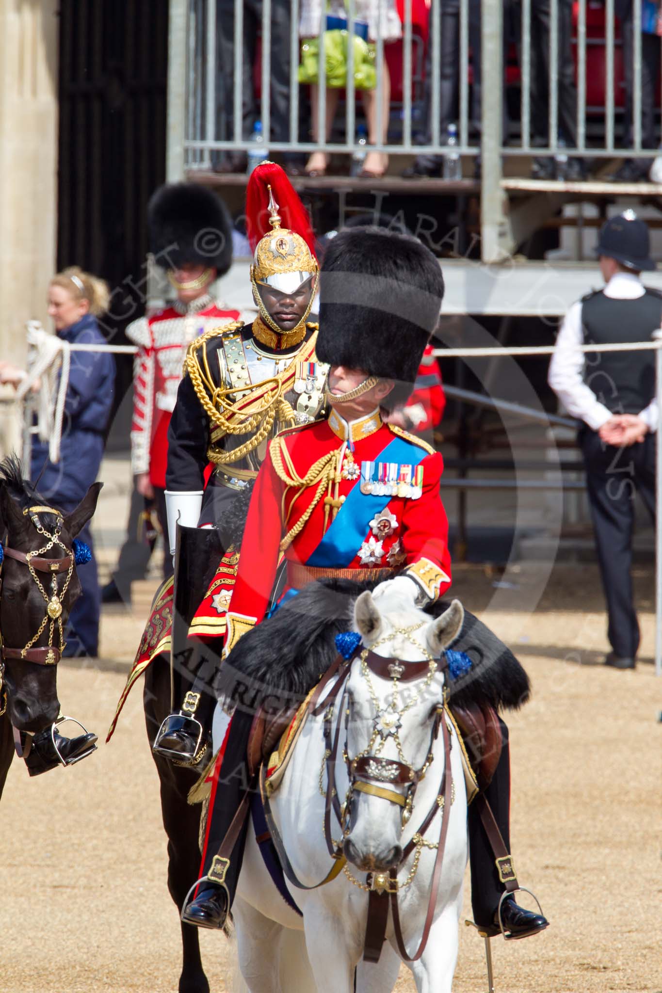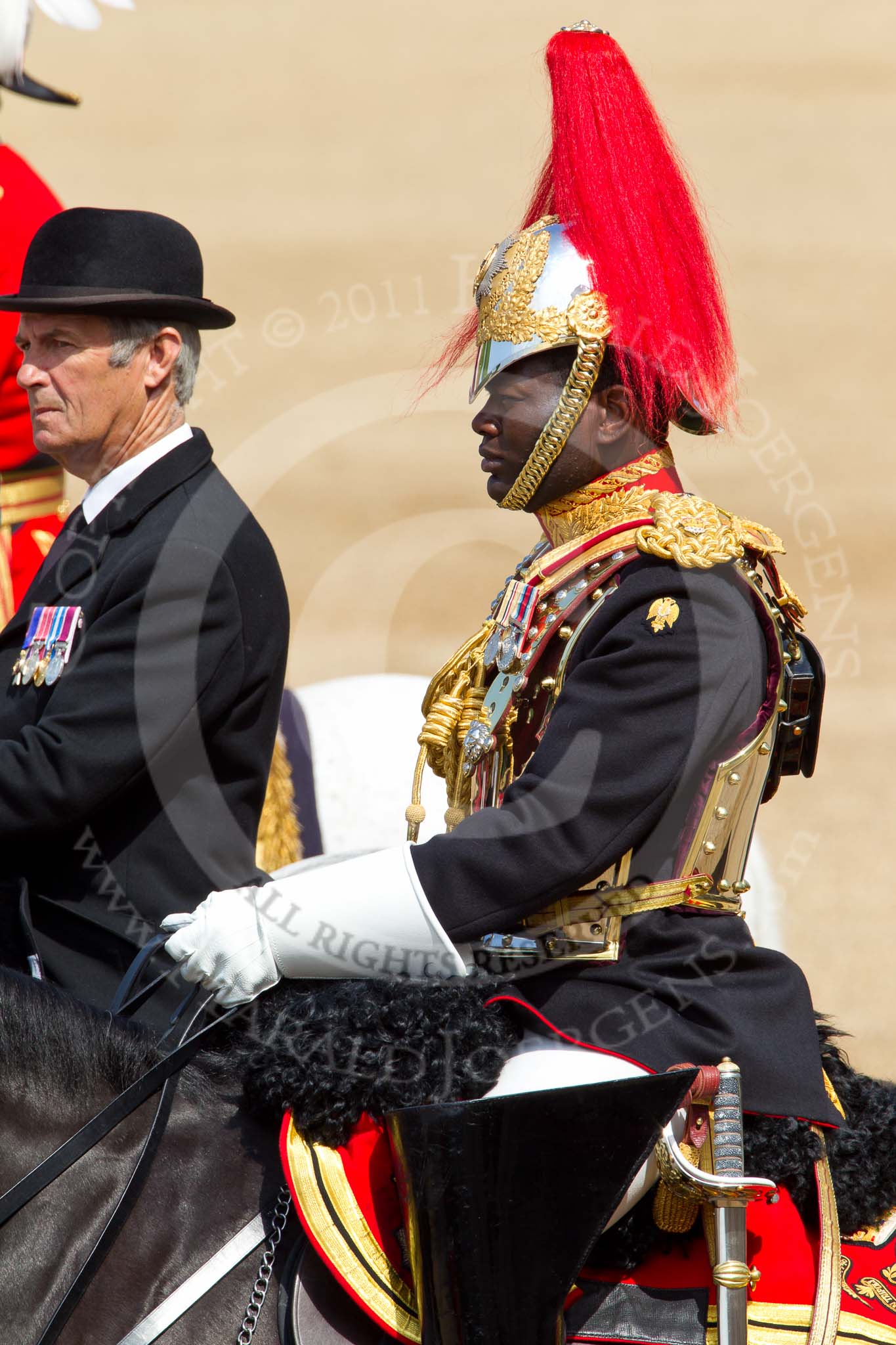 The Colonel's Review 2011: During The Colonel's Review standing in for The Princess Royal, Major Twumasi-Ankrah, Blues and Royals. Next to him the Queen's Stud Groom, riding in place of The Prince of Wales.. Horse Guards Parade, Westminster, London SW1, United Kingdom, on 04 June 2011 at 11:00, image #86
