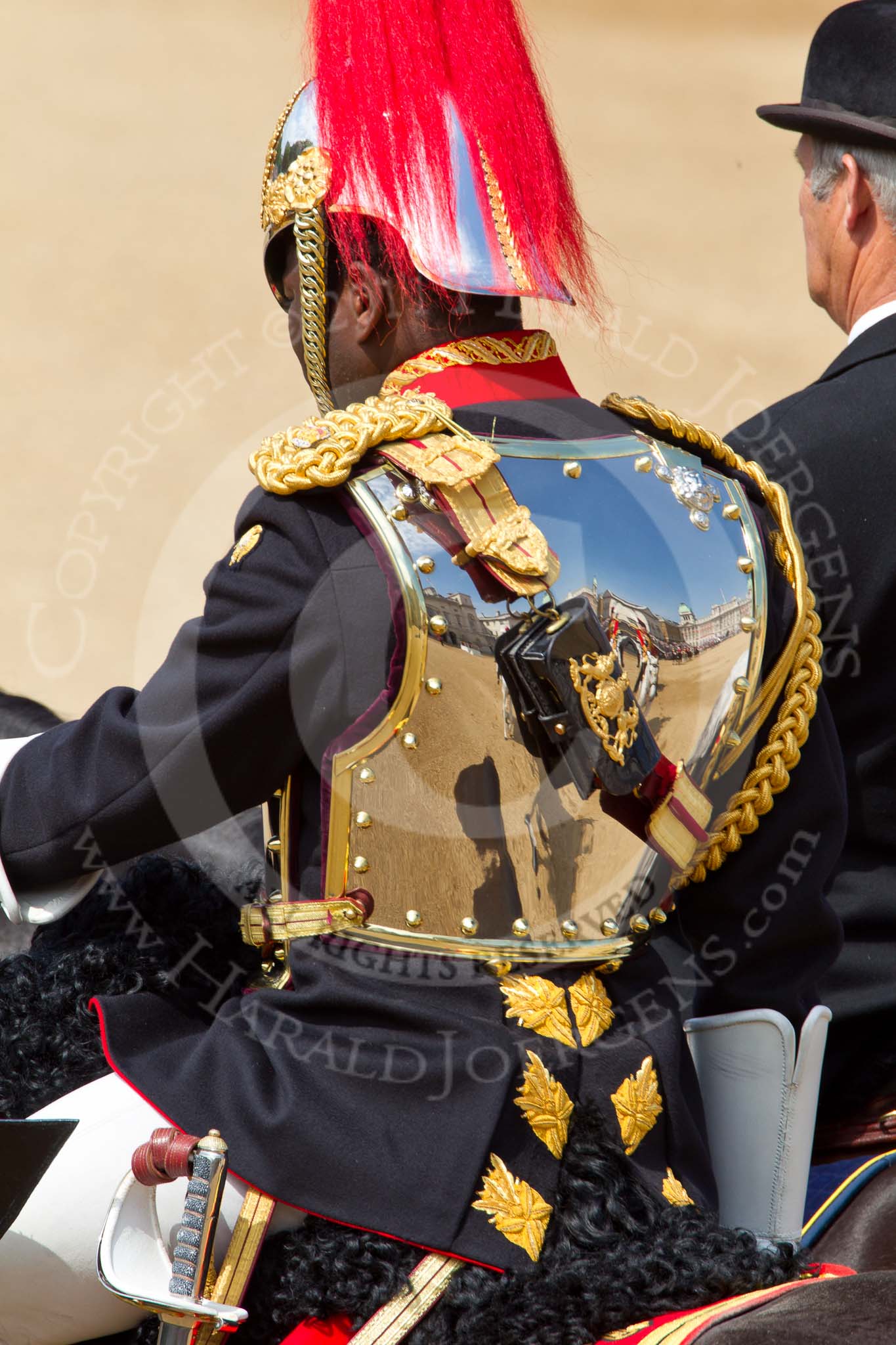 The Colonel's Review 2011: During the Colonel's Review standing in for the Princess Royal, Major Twumasi-Ankrah, Blues and Royals, in front, next to him the Queen's Stud Groom, standing in for the Prince of Wales. The reflection in the shield shows Horse Guards- and the Old Admirality Building.. Horse Guards Parade, Westminster, London SW1, United Kingdom, on 04 June 2011 at 11:01, image #89