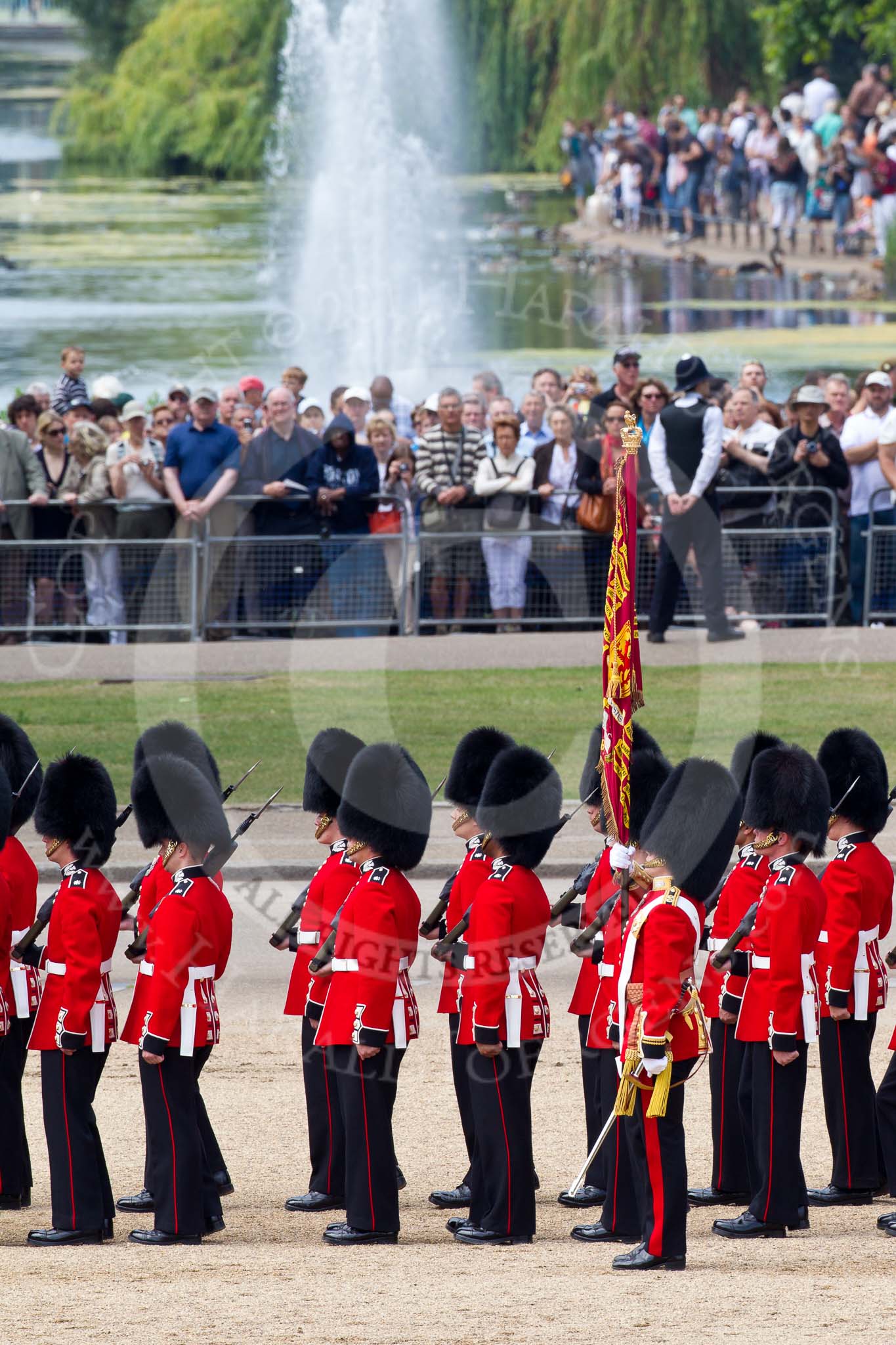 The Colonel's Review 2011: The Escort to the Colour, in front the Ensign, Lieutenant Tom Ogilvy, with the Colour. In the background spectators watching from St. James's Park..