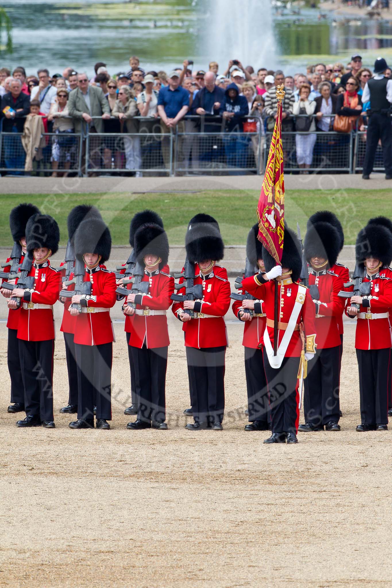 The Colonel's Review 2011: The Escort to the Colour, presenting arms. In front the Ensign, Lieutenant Tom Ogilvy, with the Colour. In the background spectators watching from St. James's Park..