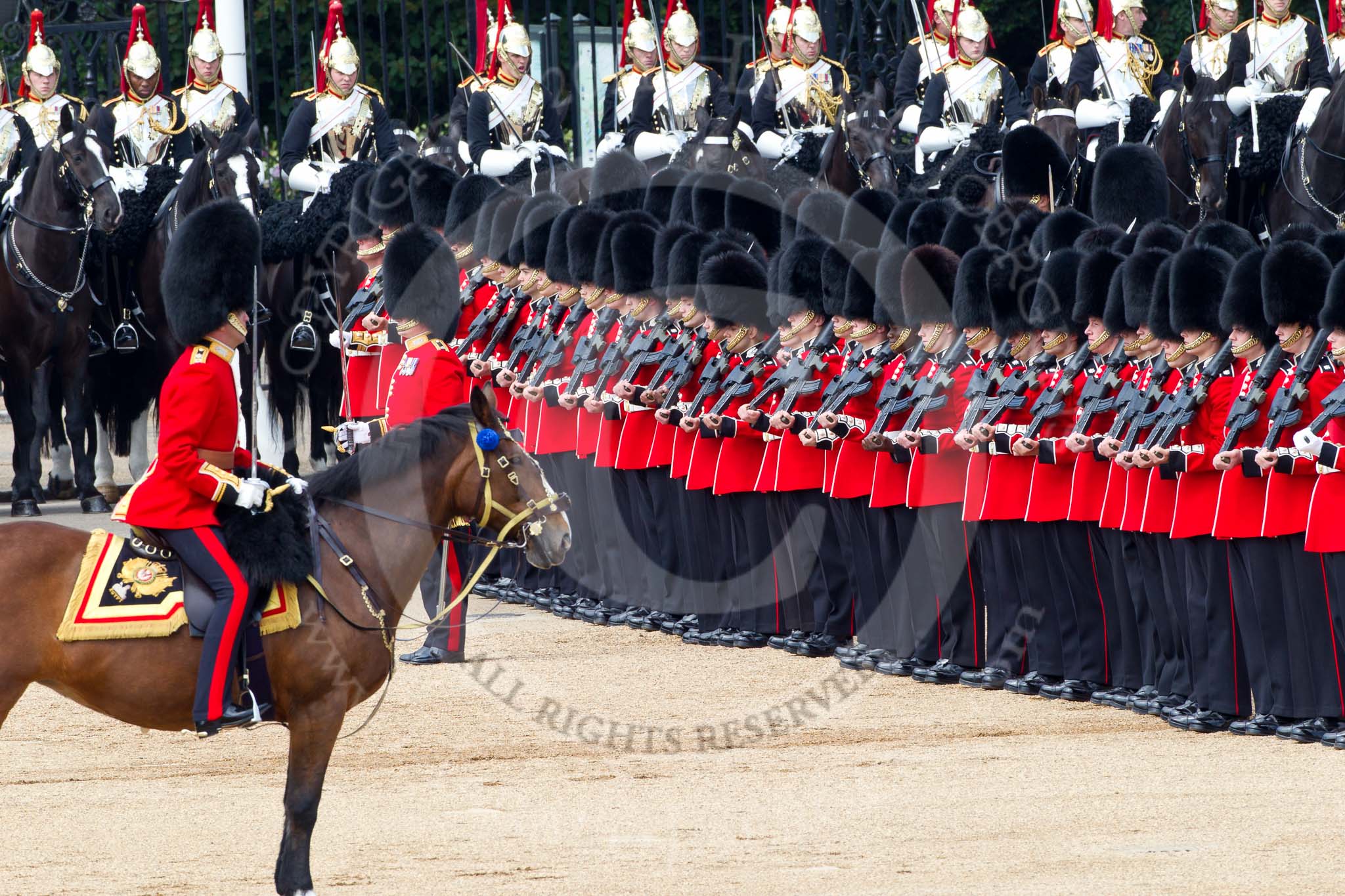 The Colonel's Review 2011: The Trooping The Colour through the ranks in slow time is over, and the Field Officer, Lieutenant Colonel L P M Jopp, on the left, gives order to slope arms, completing the Trooping phrase of the parade.. Horse Guards Parade, Westminster, London SW1, United Kingdom, on 04 June 2011 at 11:30, image #153