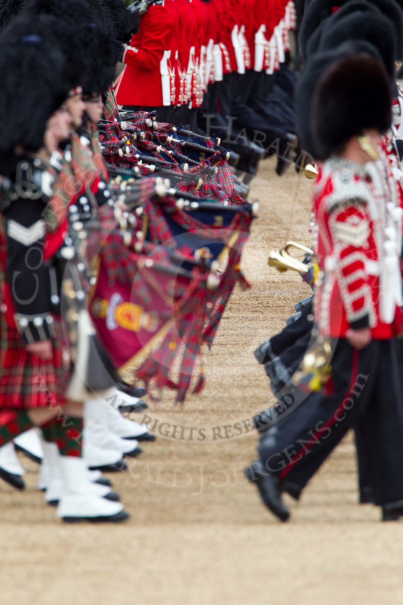 The Major General's Review 2011: Marching. The Massed Bands, the Pipers of the Scots Guards following the Drummers, marching to the right, and a guard division marching to the left.. Horse Guards Parade, Westminster, London SW1, Greater London, United Kingdom, on 28 May 2011 at 11:31, image #196