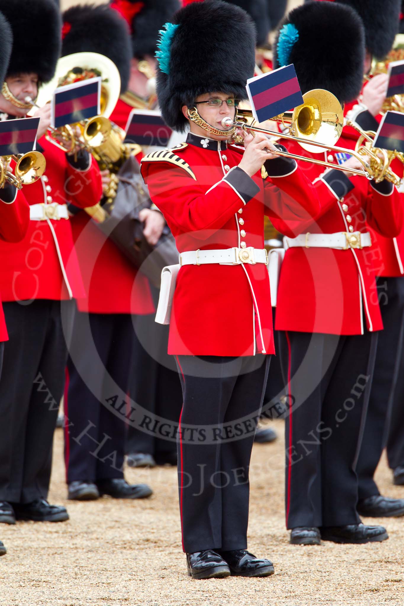 The Major General's Review 2011: Massed Bands playing, in front a trombonist grom the Band of the Irish Guards.. Horse Guards Parade, Westminster, London SW1, Greater London, United Kingdom, on 28 May 2011 at 11:39, image #214