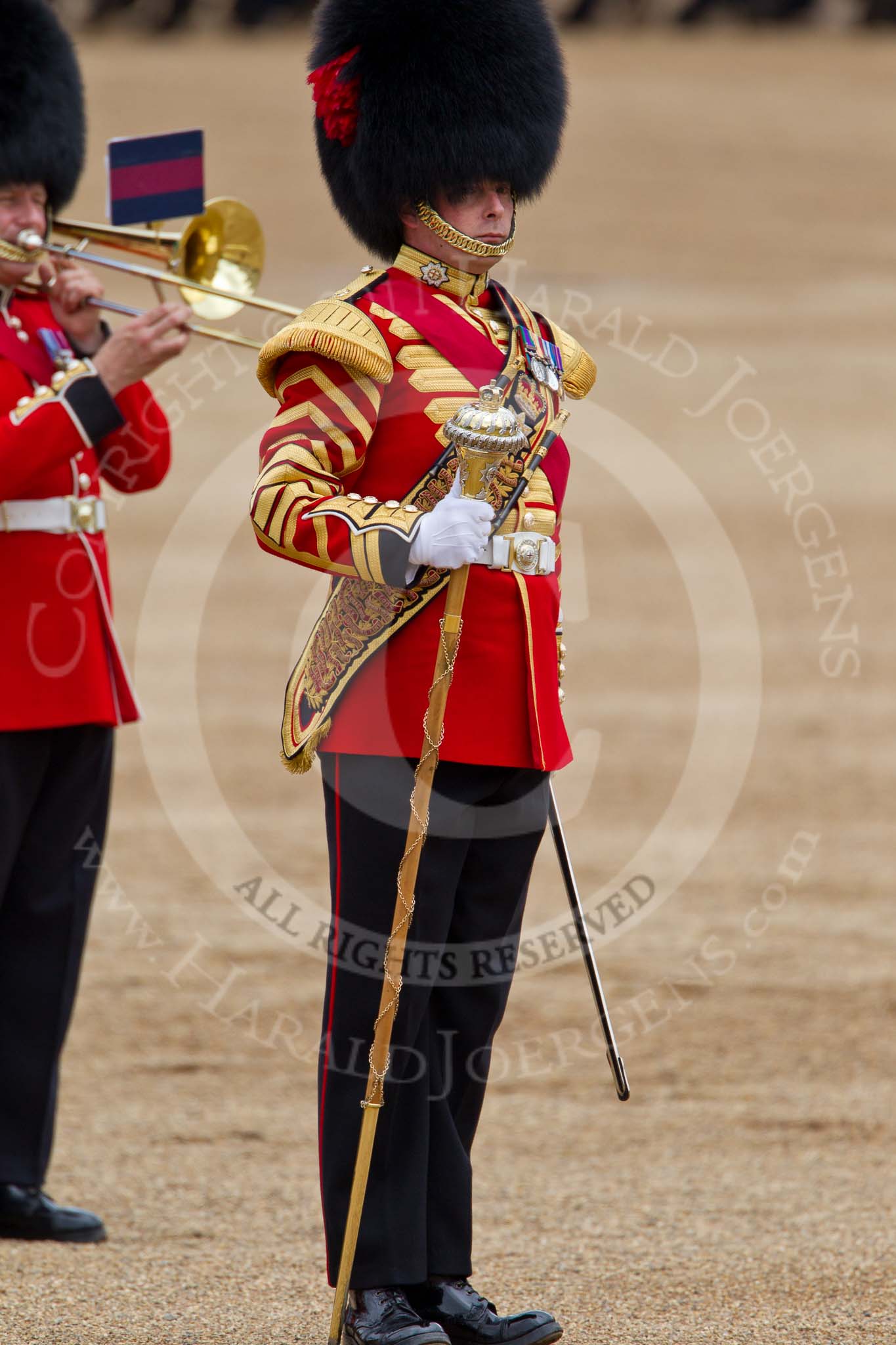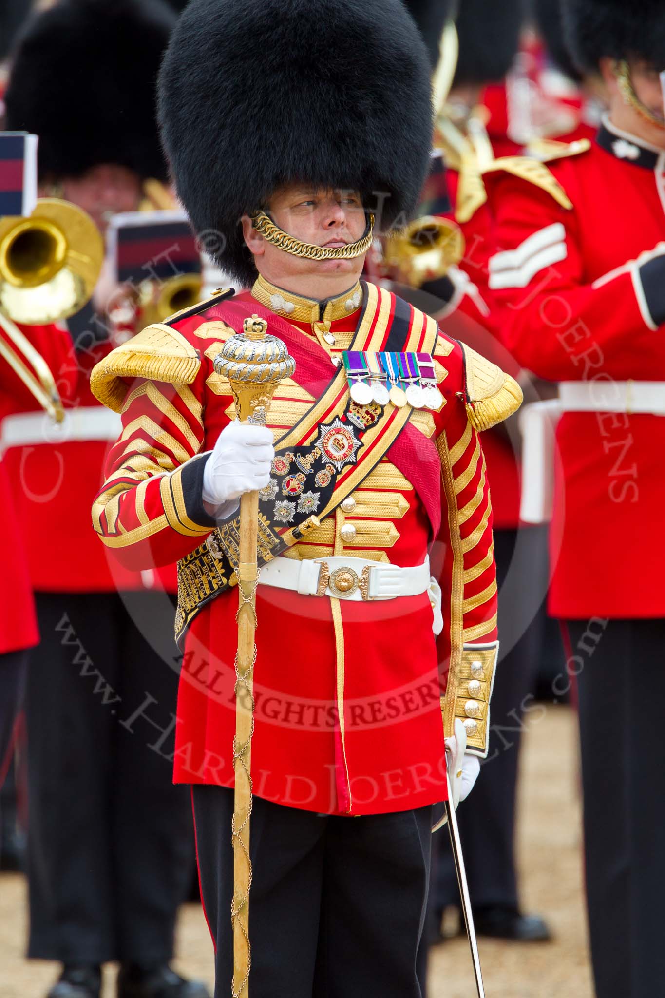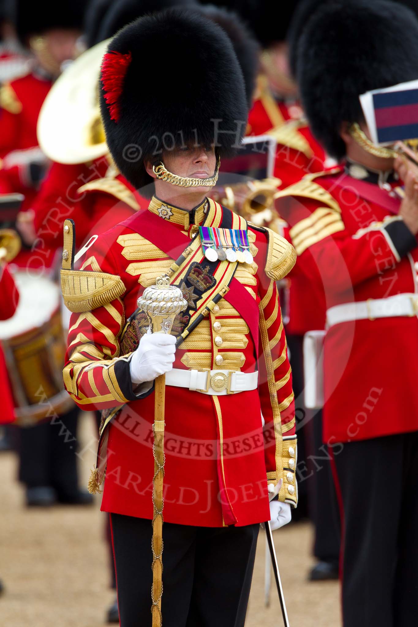 The Major General's Review 2011: Drum Major Tony Taylor, No. 7 Company Coldstream Guards, leading the Band of the Irish Guards.. Horse Guards Parade, Westminster, London SW1, Greater London, United Kingdom, on 28 May 2011 at 11:39, image #215