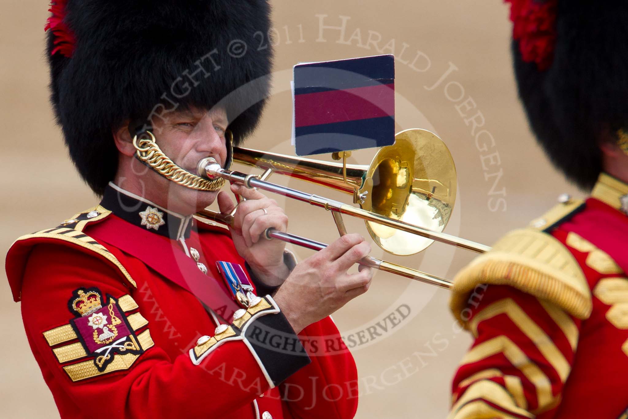 The Major General's Review 2011: Close-up of a Company Sergeant Major of the Coldstream Guards playing the trombone.. Horse Guards Parade, Westminster, London SW1, Greater London, United Kingdom, on 28 May 2011 at 11:40, image #218