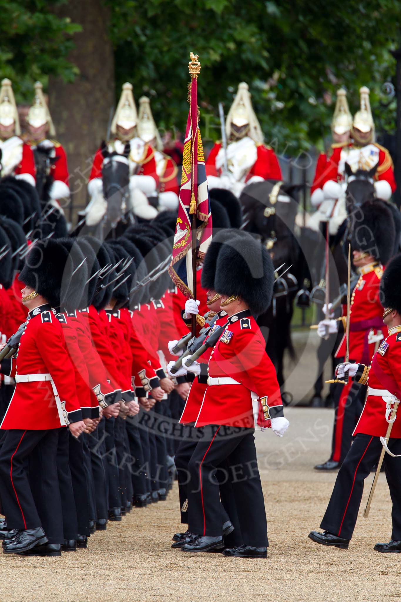 The Major General's Review 2011: The Escort to the Colour, No. 1 Guard, 1st Battalion Scots Guards, during the March Past in slow time, the Ensign, Lieutenant Tom Ogilvy, carrying the Colour. In the background the Household Cavalry, here The Life Guards.. Horse Guards Parade, Westminster, London SW1, Greater London, United Kingdom, on 28 May 2011 at 11:42, image #220