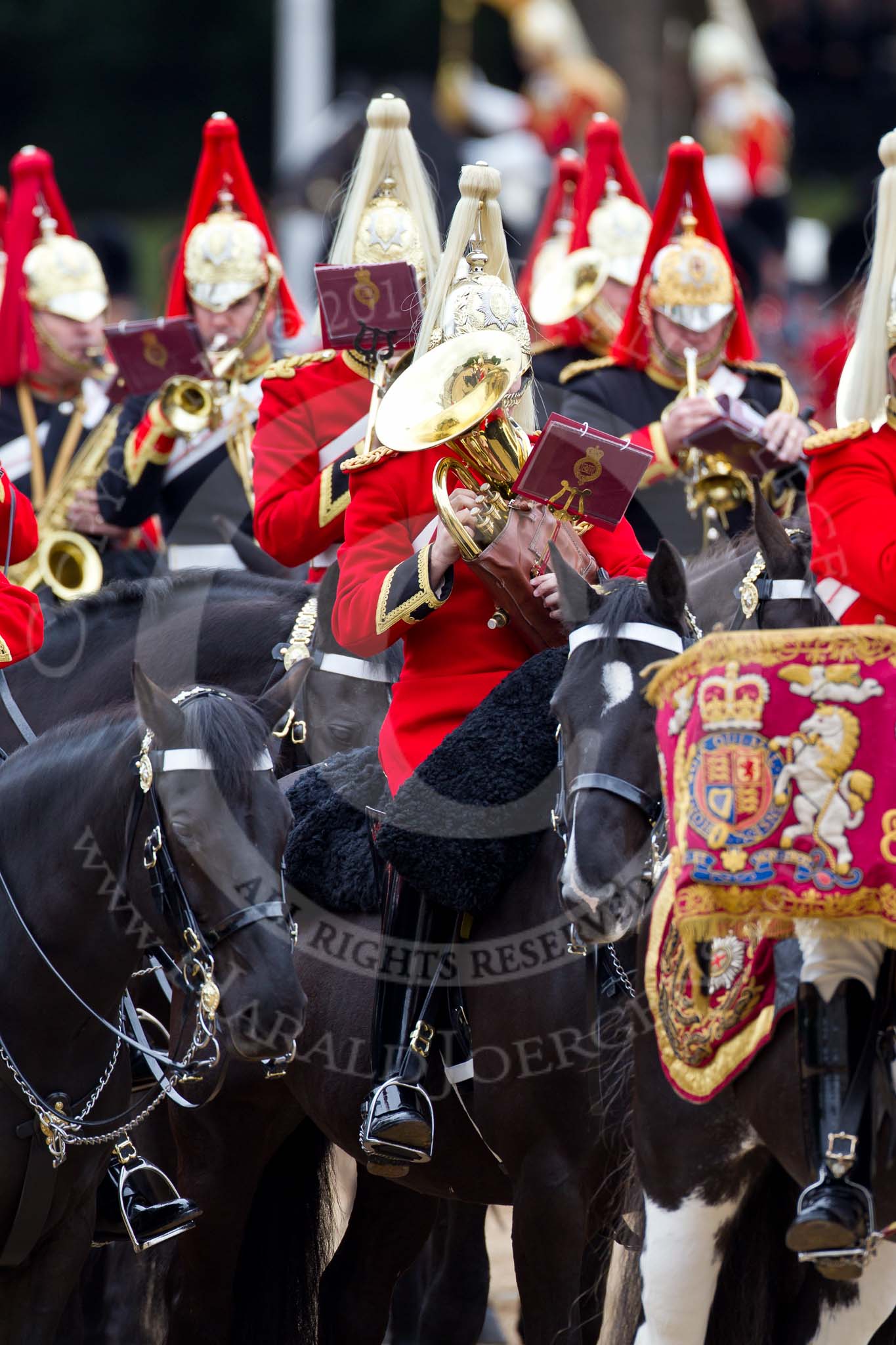 The Major General's Review 2011: The Director of Music, Major K L Davies,The Life Guards, leading the Mounted Bands, behind him musicians of The Blues and Royals, in front their kettle drummer.. Horse Guards Parade, Westminster, London SW1, Greater London, United Kingdom, on 28 May 2011 at 11:56, image #248