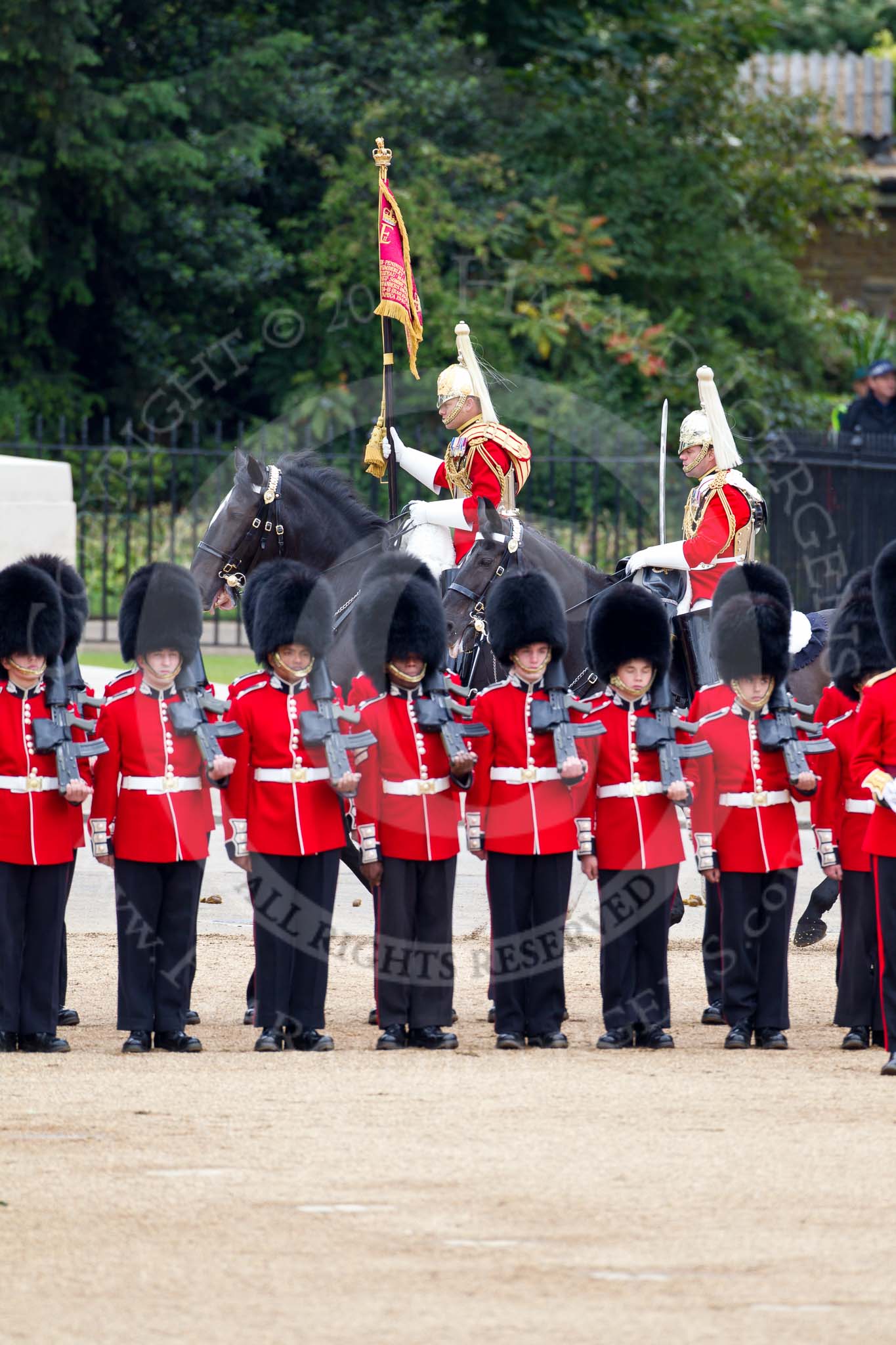 The Major General's Review 2011: The Standard Bearer, Squadron Corporal Major B K Gibson, The Life Guards, followed by the Standard Coverer, riding behind No. 2 Guard, B Company Scots Guards.. Horse Guards Parade, Westminster, London SW1, Greater London, United Kingdom, on 28 May 2011 at 11:56, image #251