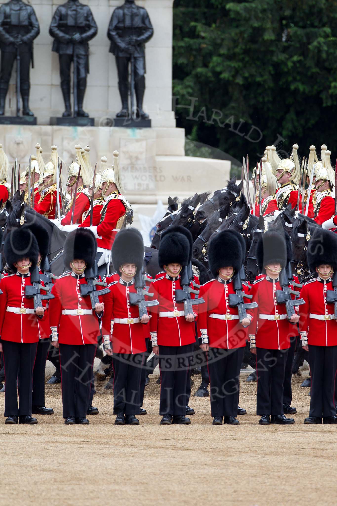 The Major General's Review 2011: The Life Guards during the Ride Past. Here, they are passing behind No. 3 Guard, F Company Scots Guards. In the background the Guards Memorial.. Horse Guards Parade, Westminster, London SW1, Greater London, United Kingdom, on 28 May 2011 at 11:57, image #252