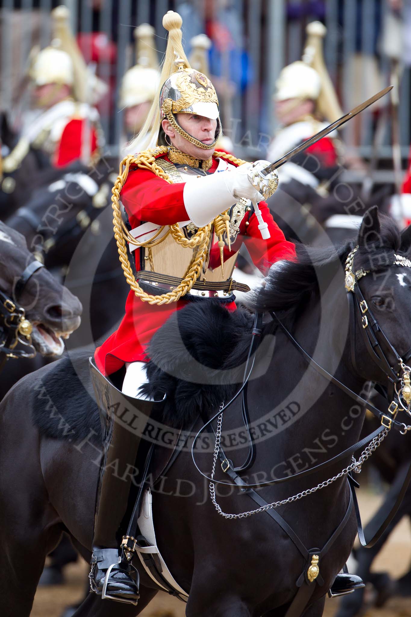 The Major General's Review 2011: The Field Officer of the Sovereign’s Escort of the Household Cavalry, Major Nicolas Van Cutsem, The Life Guards. It would be a particular honour for him as a Bosnia, Iraq and Afghanistan veteran to lead the Sovereign’s Escort after that other notable event on 29 April when he executed the same prestigious task as Field Officer as he was trotting at the right side of the 1902 State Landau in which his good friend Prince William and Catherine Middleton drove on their wedding day. His daughter Grace was also one of the bridesmaids.. Horse Guards Parade, Westminster, London SW1, Greater London, United Kingdom, on 28 May 2011 at 11:57, image #255