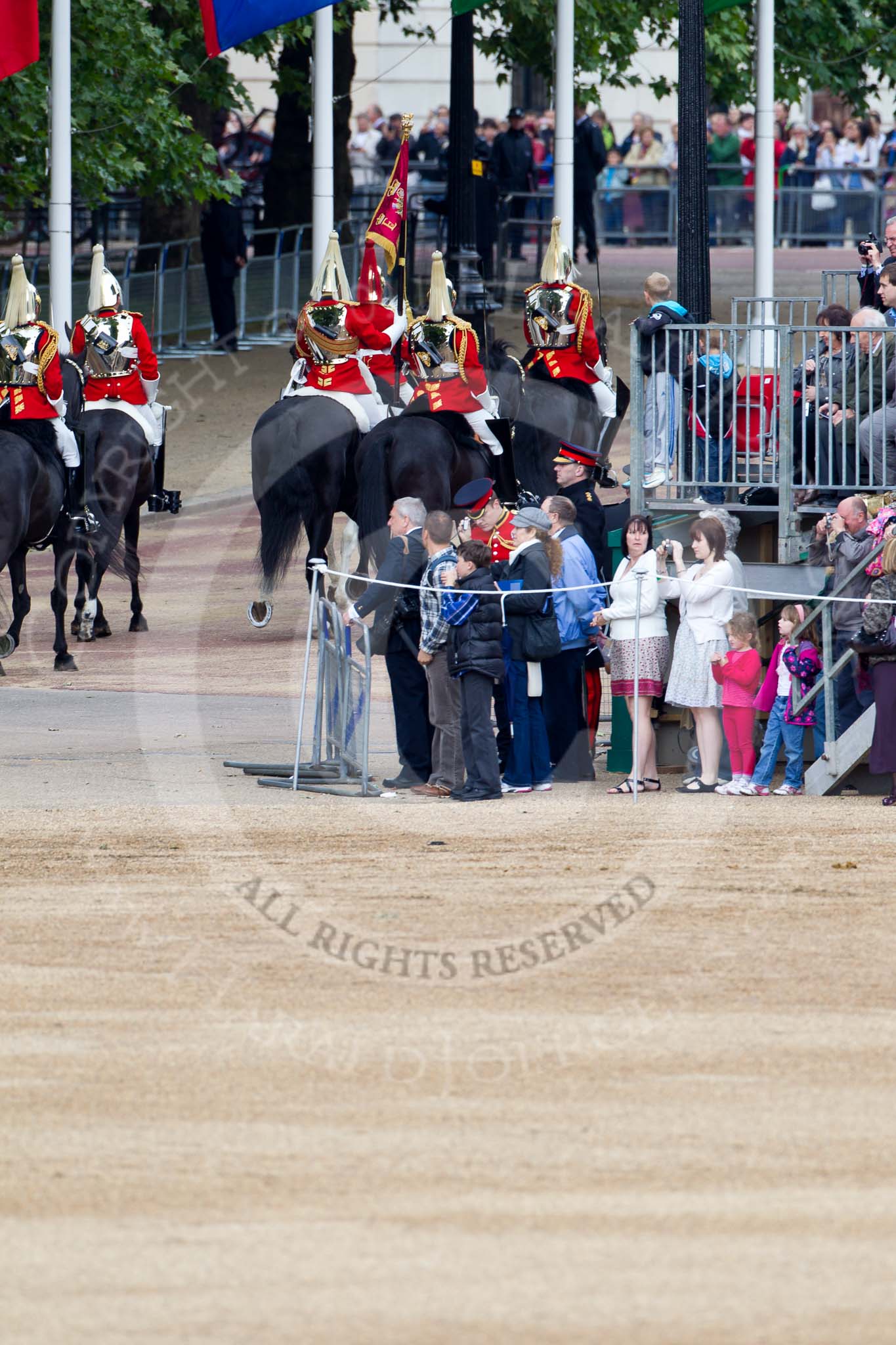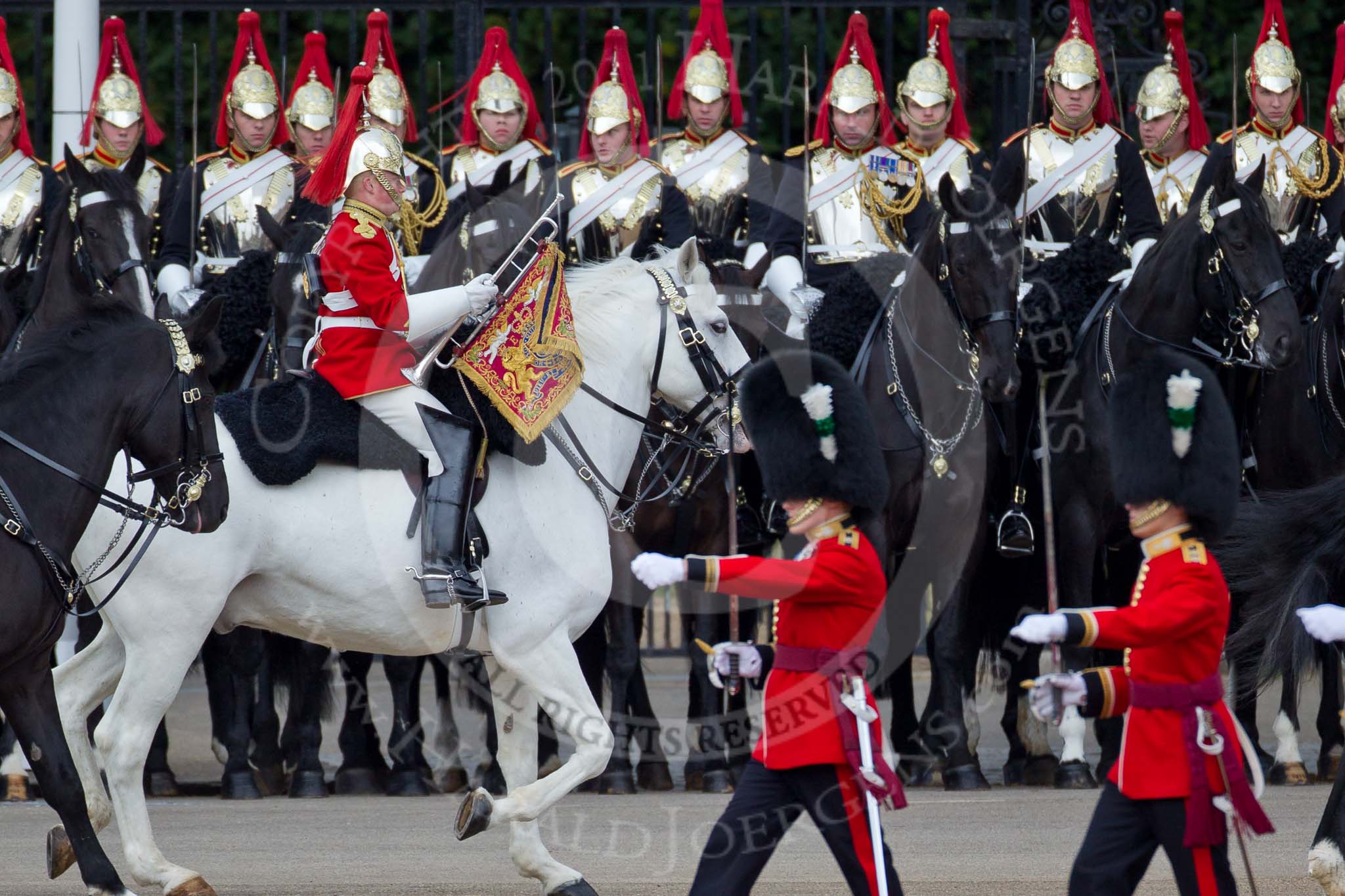 The Major General's Review 2011: March Off. Trumpeter, Standard Bearer, and Standard Coverer, followed by The Life Guards, leaving the parade ground towards The Mall.. Horse Guards Parade, Westminster, London SW1, Greater London, United Kingdom, on 28 May 2011 at 12:05, image #273