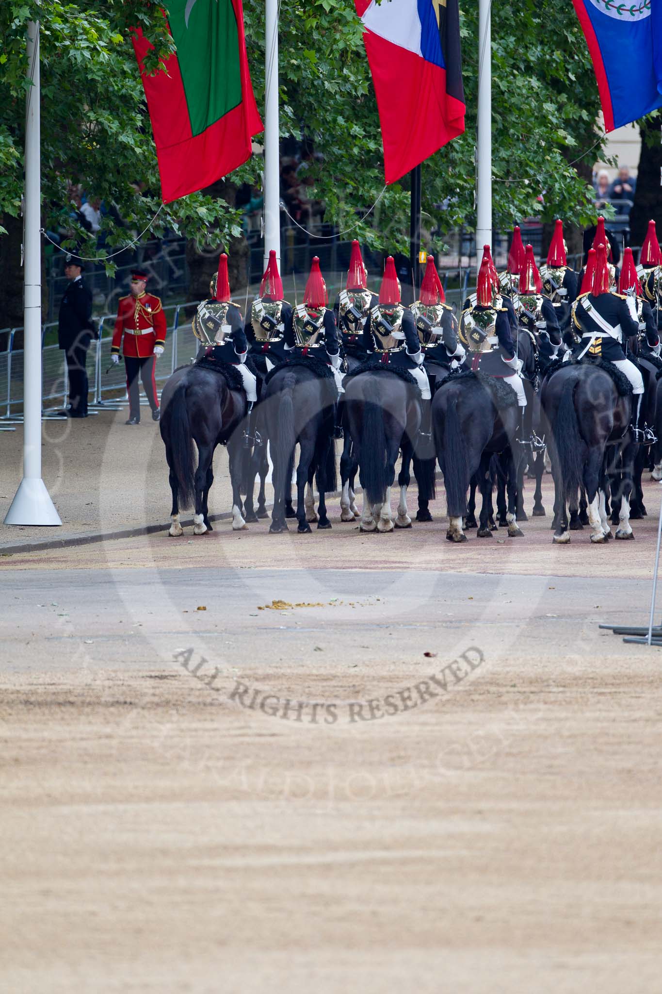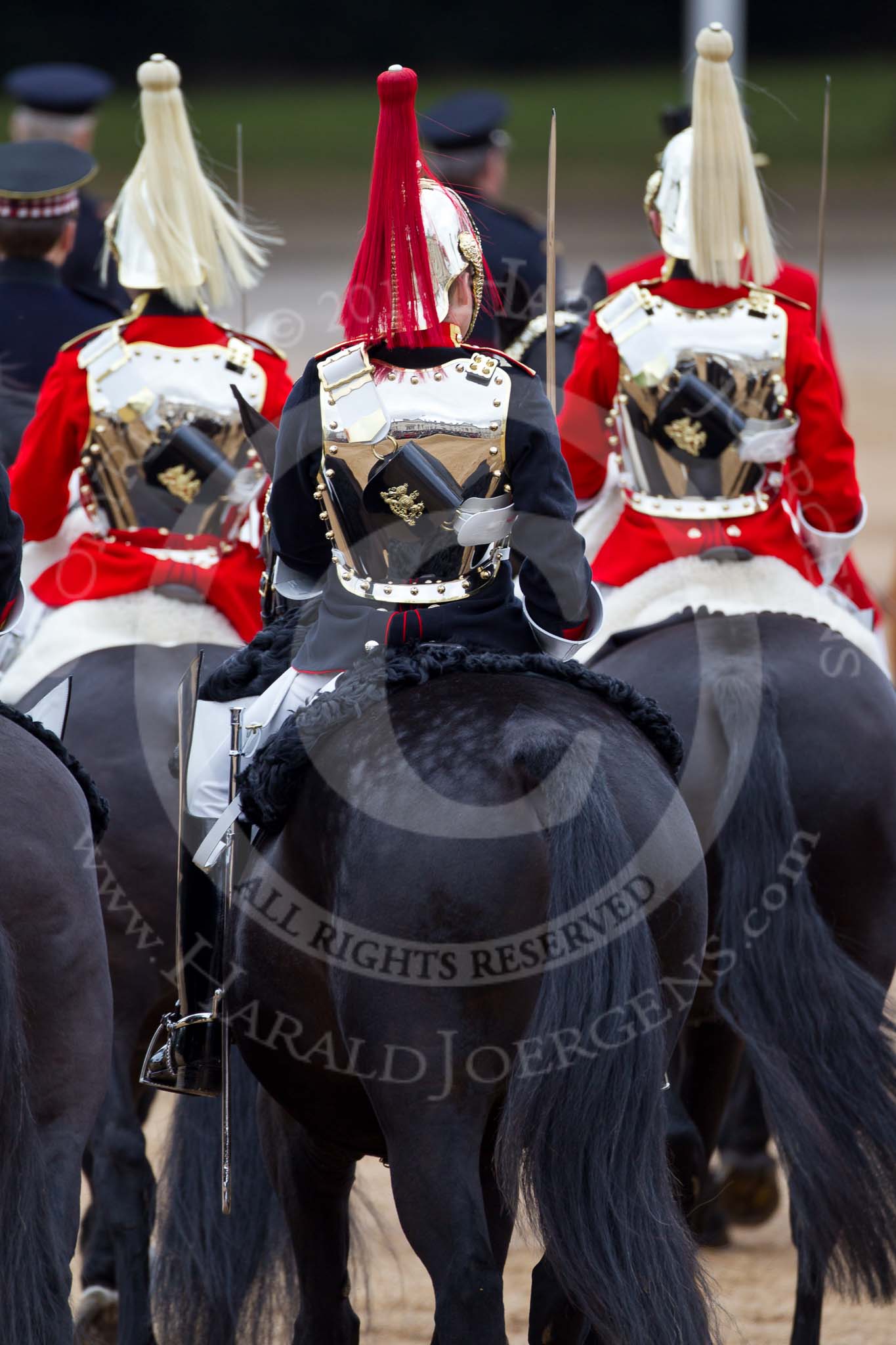 The Major General's Review 2011: March off - the four Troopers of The Life Guards, and the four Troopers of The Blues and Royals leaving the parade ground.. Horse Guards Parade, Westminster, London SW1, Greater London, United Kingdom, on 28 May 2011 at 12:10, image #285
