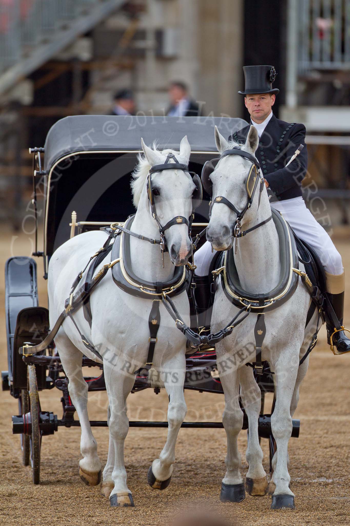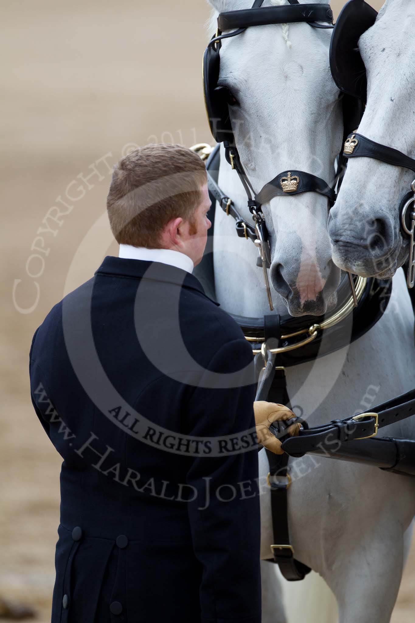 The Major General's Review 2011: A Footman from the Royal Mews with the two Windsor Grey horses that will be pulling the ivory mounted phaeton used by HM The Queen during the parade.. Horse Guards Parade, Westminster, London SW1, Greater London, United Kingdom, on 28 May 2011 at 12:07, image #278