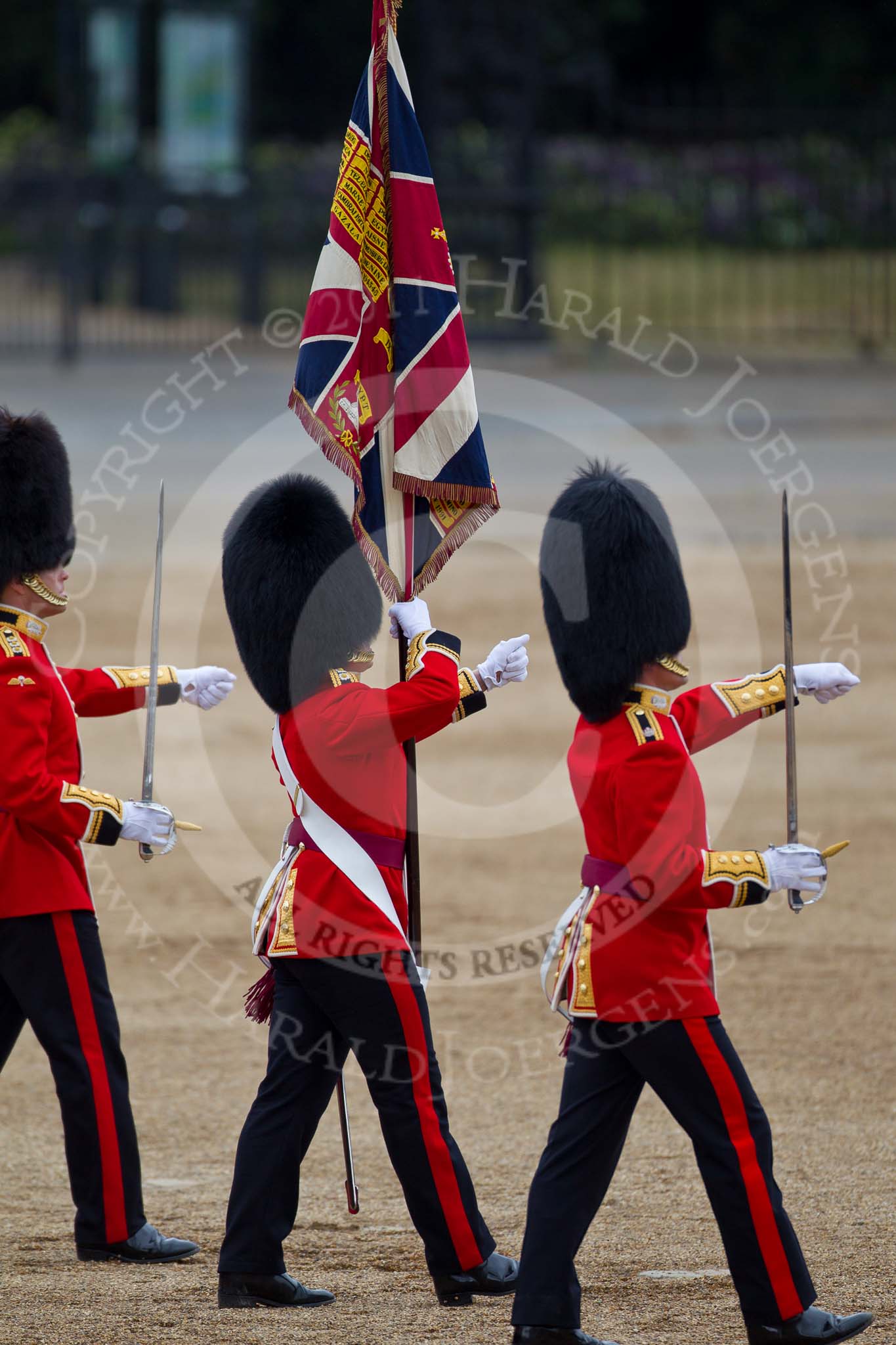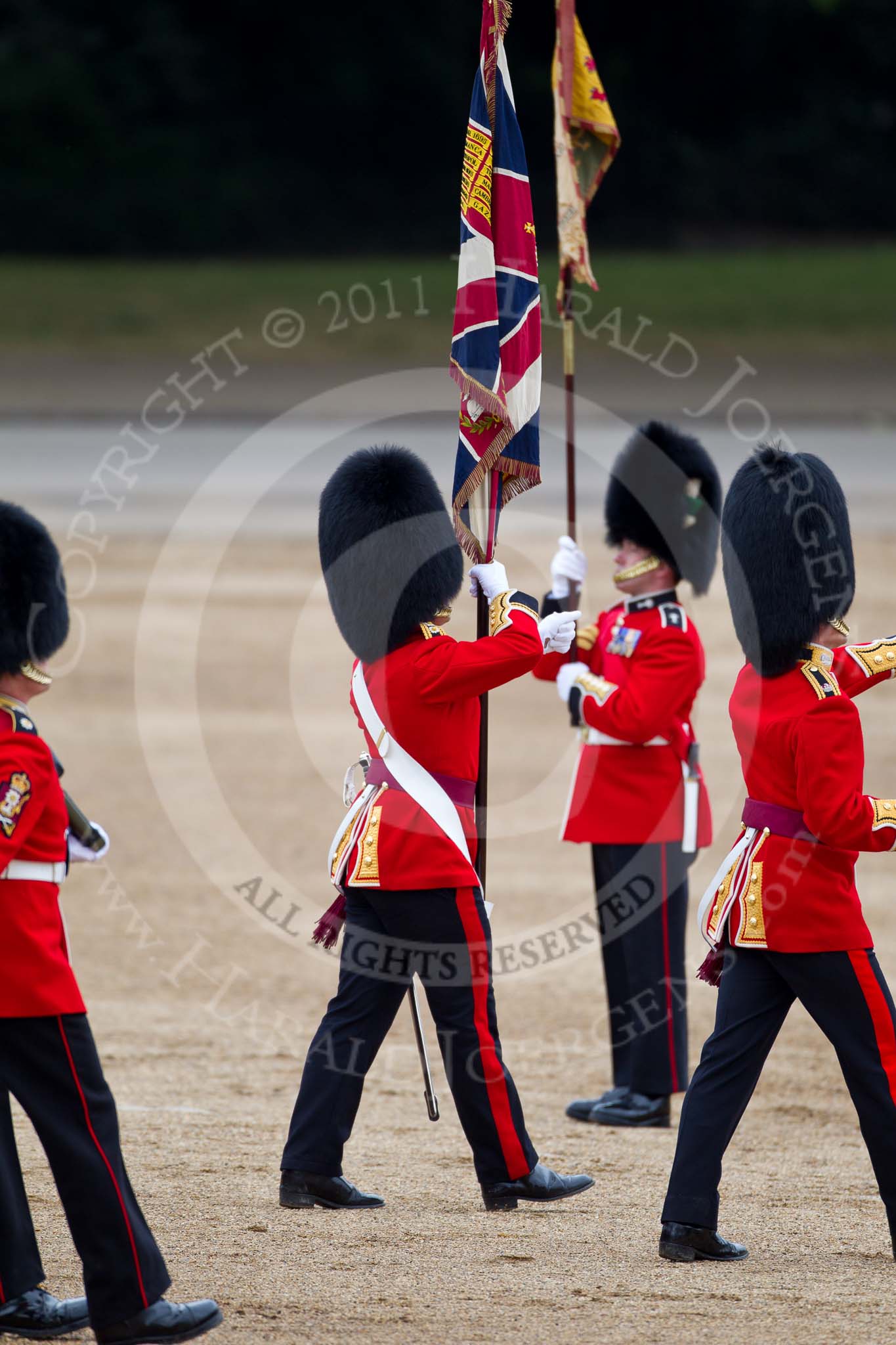 The Major General's Review 2011: Marching off - the Ensign with the Colour, on his left the Subaltern of the Escort, Captain Krause-Harder-Colthorpe.. Horse Guards Parade, Westminster, London SW1, Greater London, United Kingdom, on 28 May 2011 at 12:09, image #283