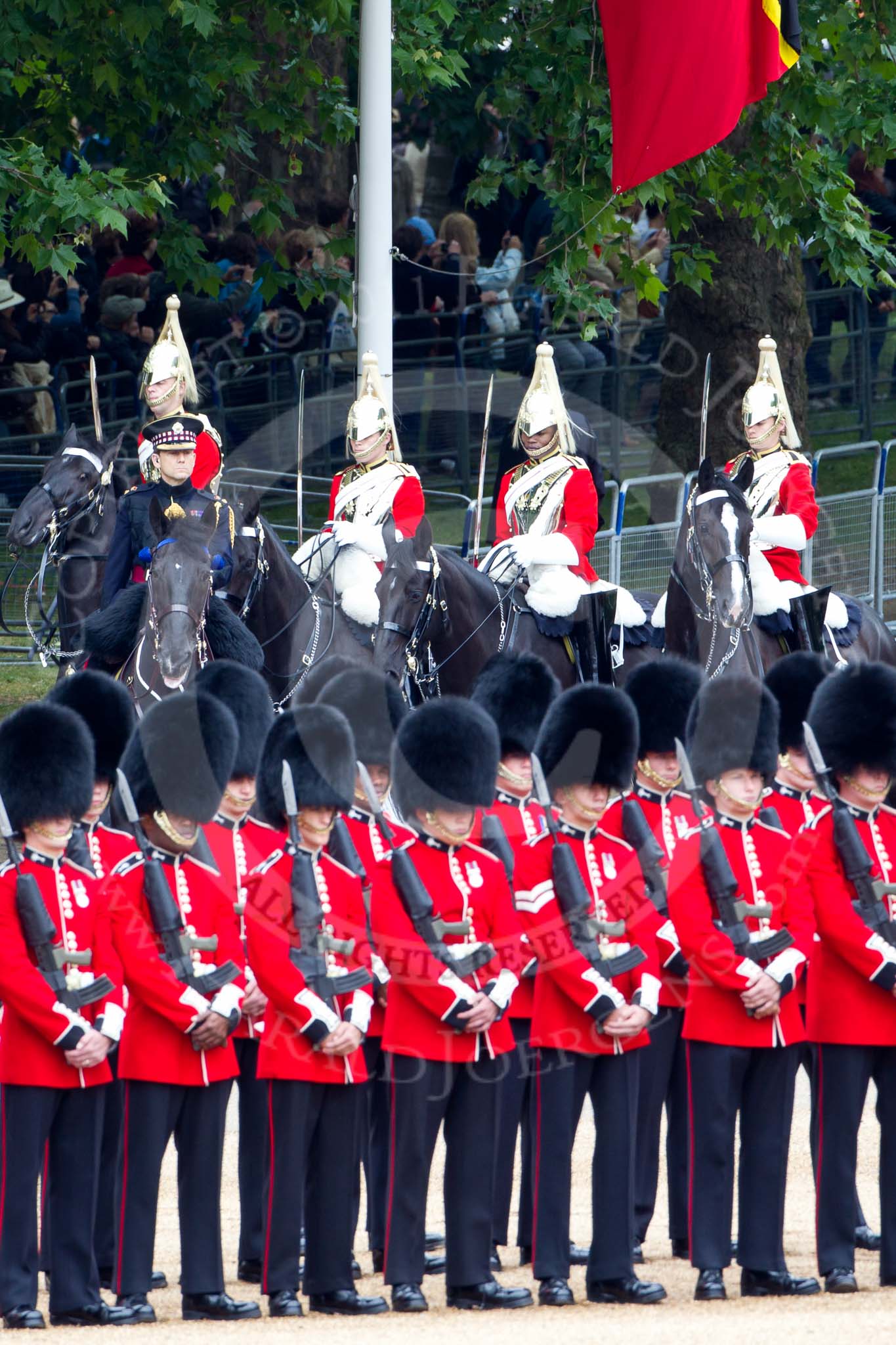 The Major General's Review 2011: The arrival of the Royal Party. Brigade Major Household Division, Lieutenant Colonel A P Speed, followed by four Troopers of The Life Guards, here passing behind No. 6 Guard, No. 7 Company Coldstream Guards.. Horse Guards Parade, Westminster, London SW1, Greater London, United Kingdom, on 28 May 2011 at 10:56, image #94