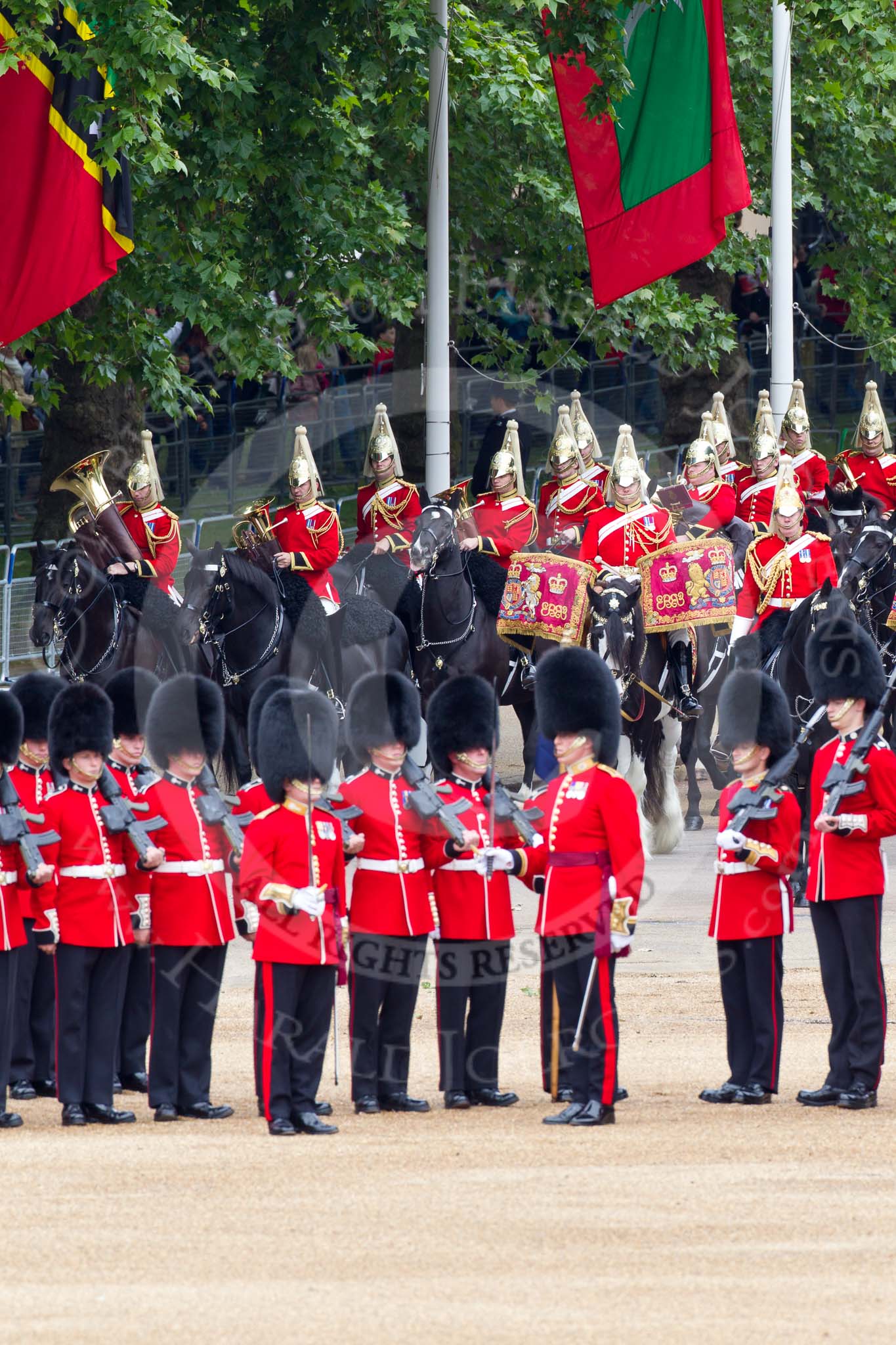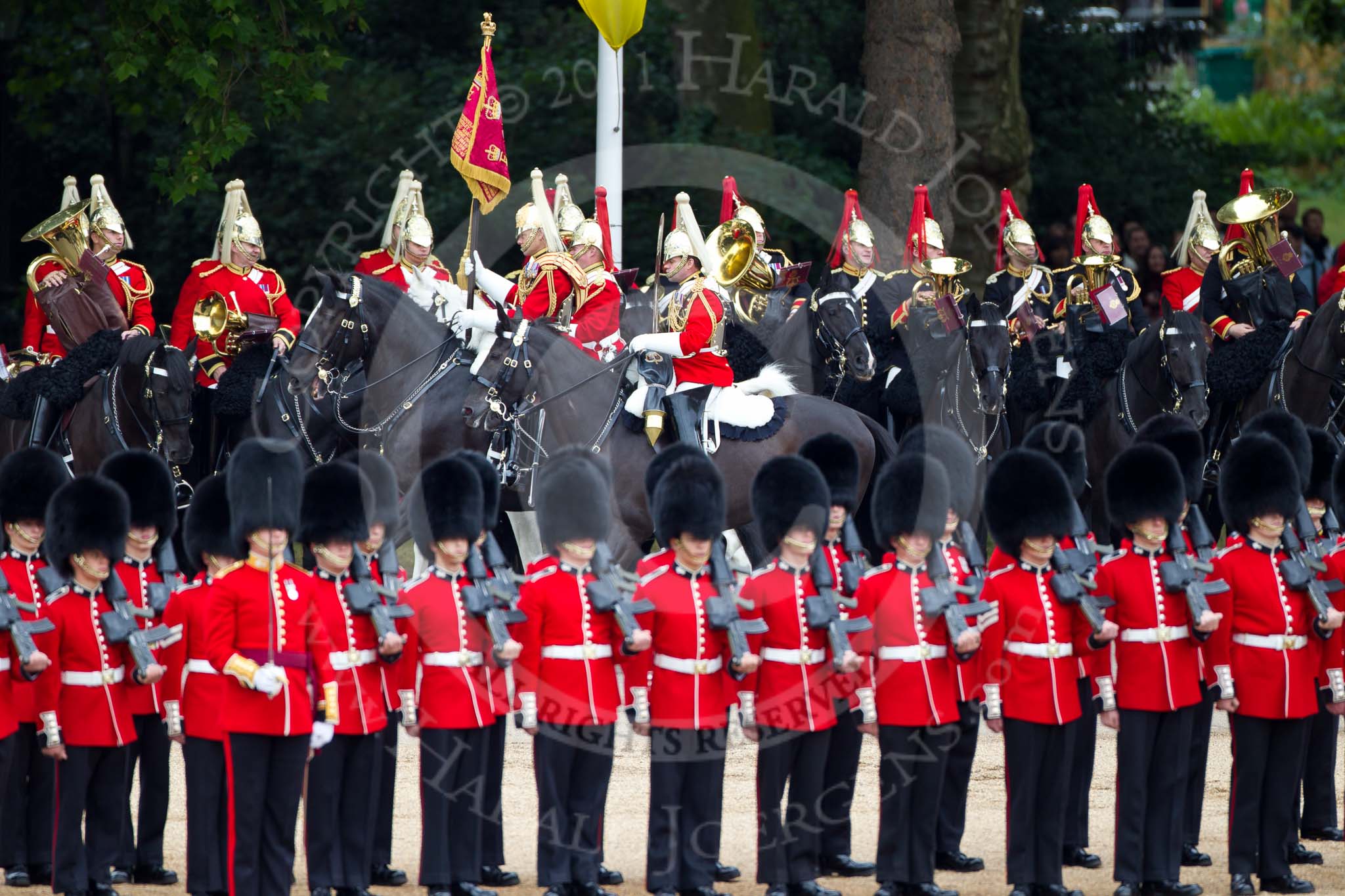 The Major General's Review 2011: The Mounted Bands of the Household Cavalry getting into position at the border of St. James's Park. In front No. 4 Guard, Nijmegen Company Grenadier Guards.. Horse Guards Parade, Westminster, London SW1, Greater London, United Kingdom, on 28 May 2011 at 10:57, image #97