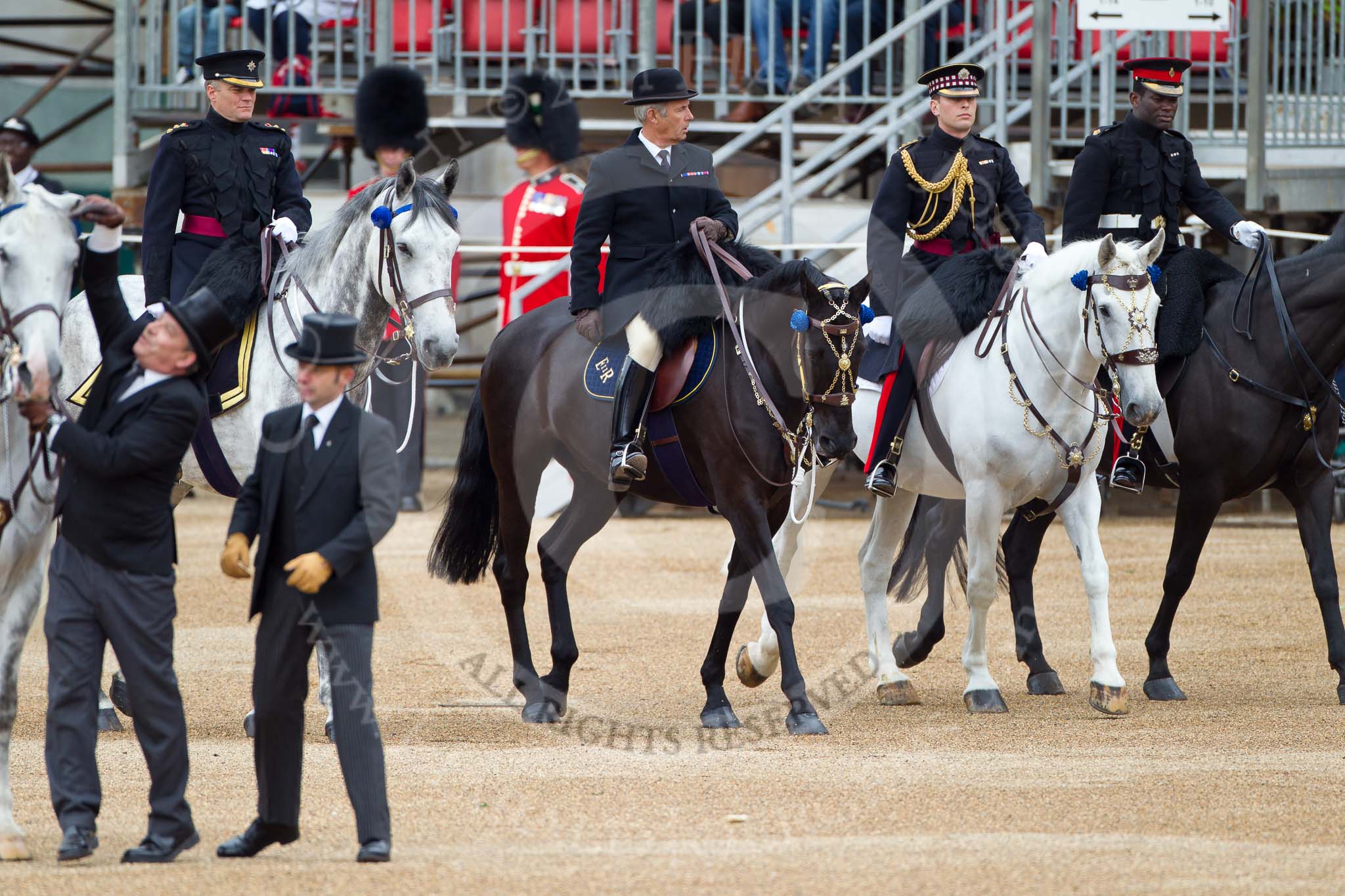 The Major General's Review 2011: In place of the Roloyal Colonels during the rehearsal, and riding their horses, from the left Colonel Ben Farrel for Prince William, the Duke of Cambridge, the Queen's Stud Groom, for the Prince of Wales, Captain Thomas Maitland-Mackill-Chrighton for the Duke of Kent, and Major Twumasi-Ankrah for the Princess Royal.. Horse Guards Parade, Westminster, London SW1, Greater London, United Kingdom, on 28 May 2011 at 10:59, image #105