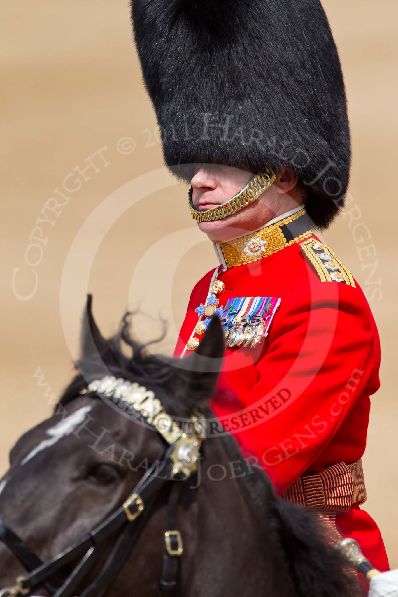 Trooping the Colour 2011: Close-up of HRH Prince William, The Duke of Cambridge, Colonel Irish Guards, at his first 'Trooping the Colour' parade.. Horse Guards Parade, Westminster, London SW1, Greater London, United Kingdom, on 11 June 2011 at 11:02, image #147