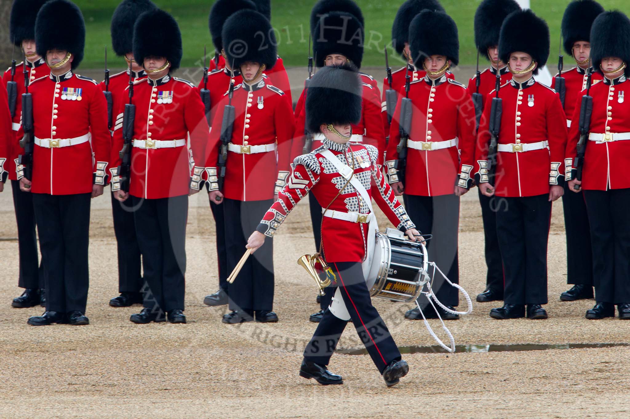 Trooping the Colour 2011: The Lone Drummer, Lance Corporal Gordon Prescott, has left the line, marching to a position at the right of the Escort to the Colour, where he will bear the 'drummers call', which will start the next phase of the parade.. Horse Guards Parade, Westminster, London SW1, Greater London, United Kingdom, on 11 June 2011 at 11:16, image #196