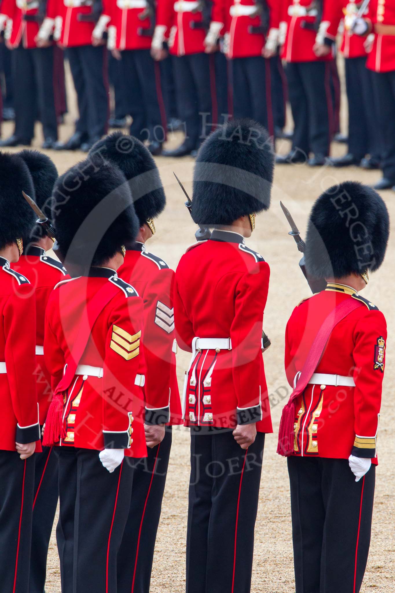 Trooping the Colour 2011: No. 4 Guard, Nijmegen Company Grenadier Guards, with Company Sergeant Major T Bearder on the very right, watching the collection of the Colour.. Horse Guards Parade, Westminster, London SW1, Greater London, United Kingdom, on 11 June 2011 at 11:19, image #199