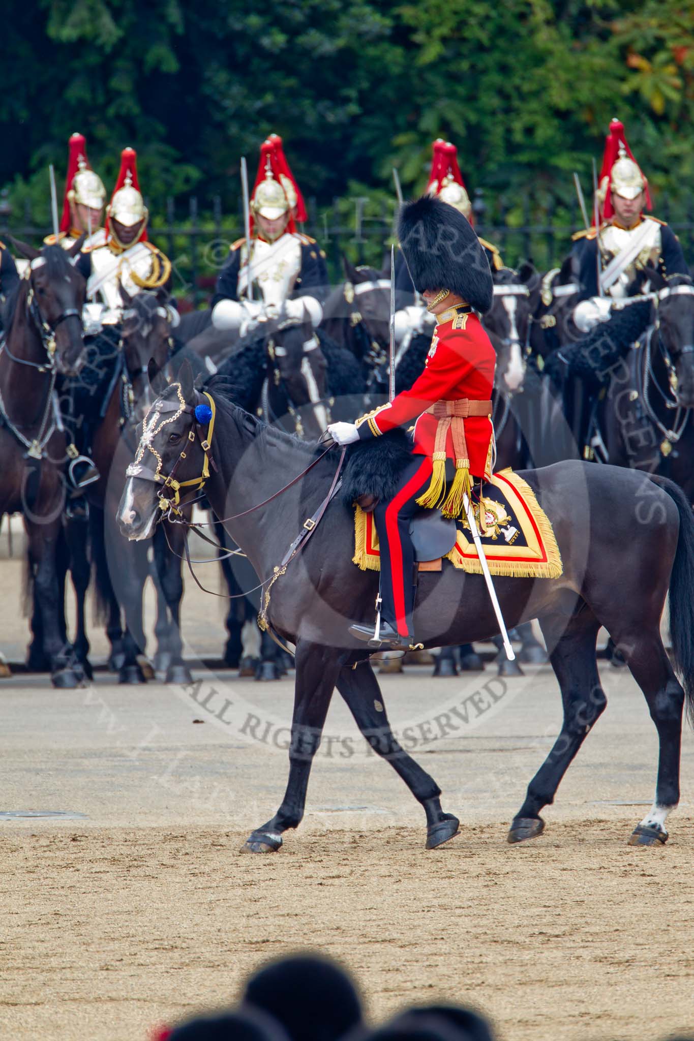 Trooping the Colour 2011: The Adjutant of the Parade, Captain Hamish Barne, 1st Battalion Scots Guards, Adjutant of the 1st Battalion Scots Guards, during the March Past. Behind, in front of the Guards Memorial, the Trumpeter and the Standard Bearer in the centre of The Life Guards.. Horse Guards Parade, Westminster, London SW1, Greater London, United Kingdom, on 11 June 2011 at 11:44, image #287
