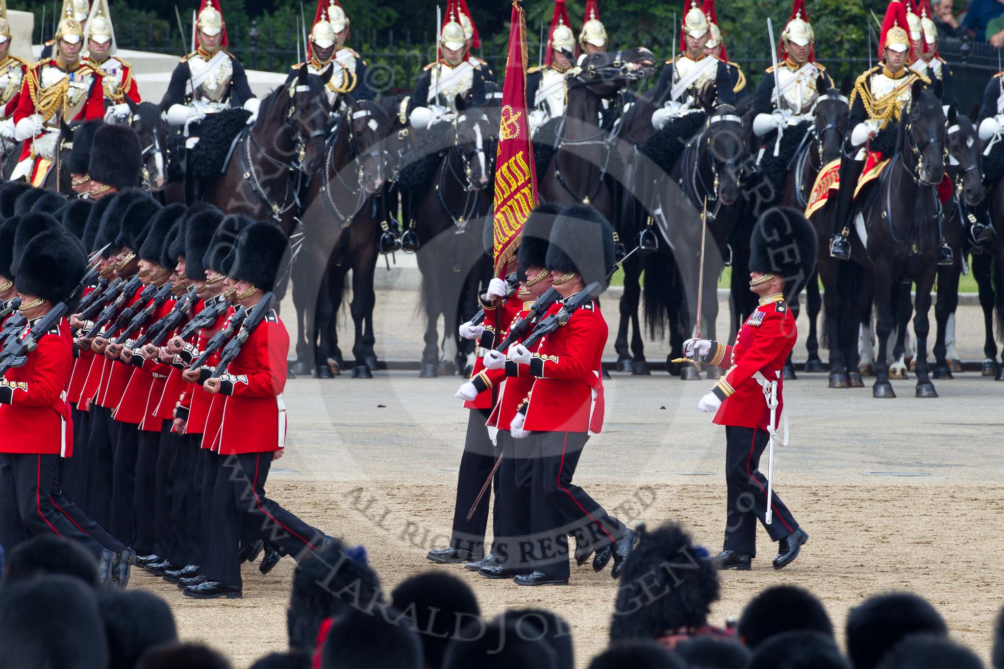 Trooping the Colour 2011: Passing the Field Officer, Lieutenant Colonel Jopp, the Escort to the Colour, 1st Battalion Scots Guards, during the March Past in slow time. Carrying the Colour the Ensign, Tom Ogilvy, to his left Colour Sergeant Chris Millin. In the background the Household Cavalry, here the Blues and Royals.. Horse Guards Parade, Westminster, London SW1, Greater London, United Kingdom, on 11 June 2011 at 11:50, image #301