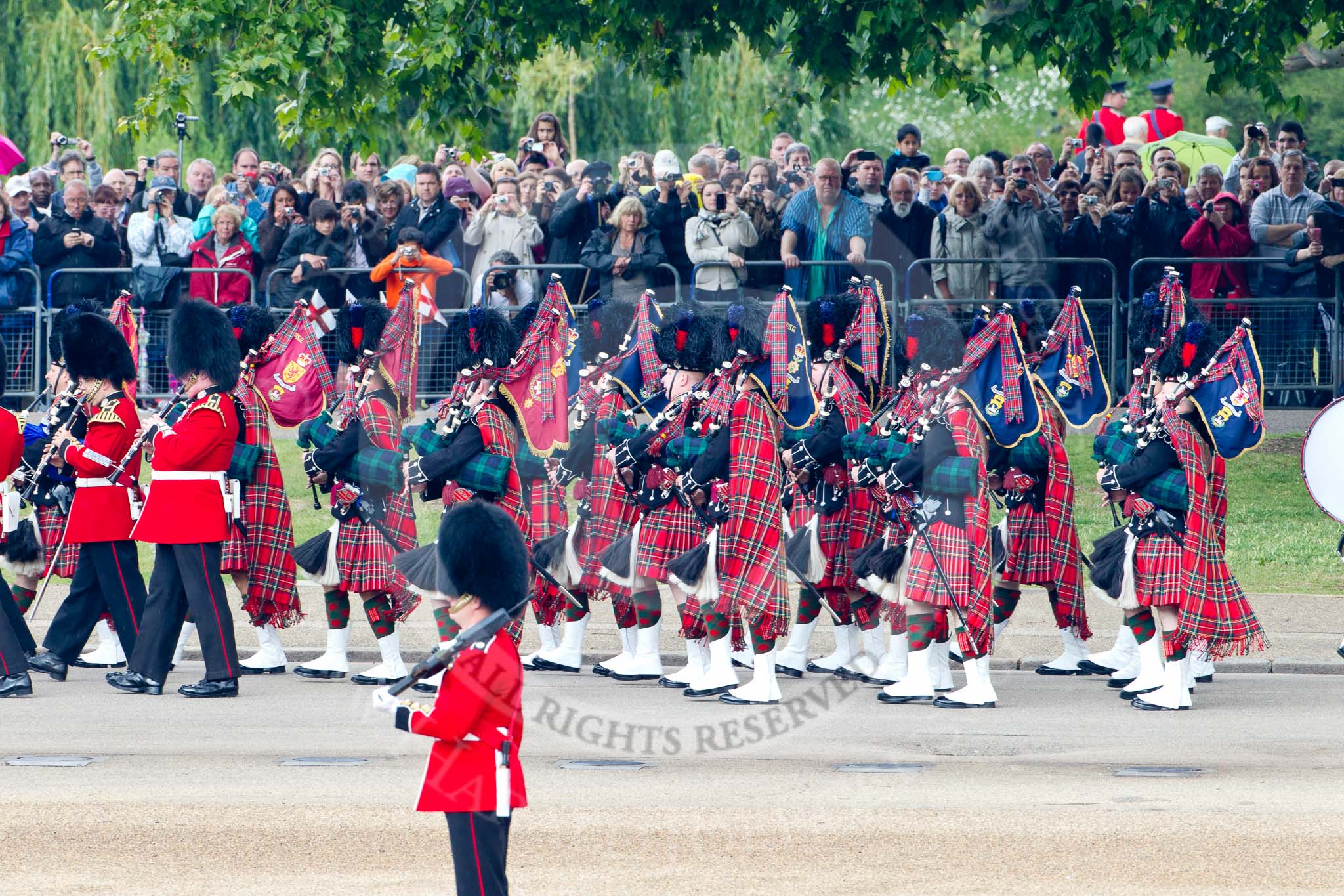 Trooping the Colour 2011: The Band of the Scots Guards, here the Pipers in their Royal Stewart Tartan, marching on Horse Guards Road, before turning onto Horse Guards Parade.. Horse Guards Parade, Westminster, London SW1, Greater London, United Kingdom, on 11 June 2011 at 10:30, image #48