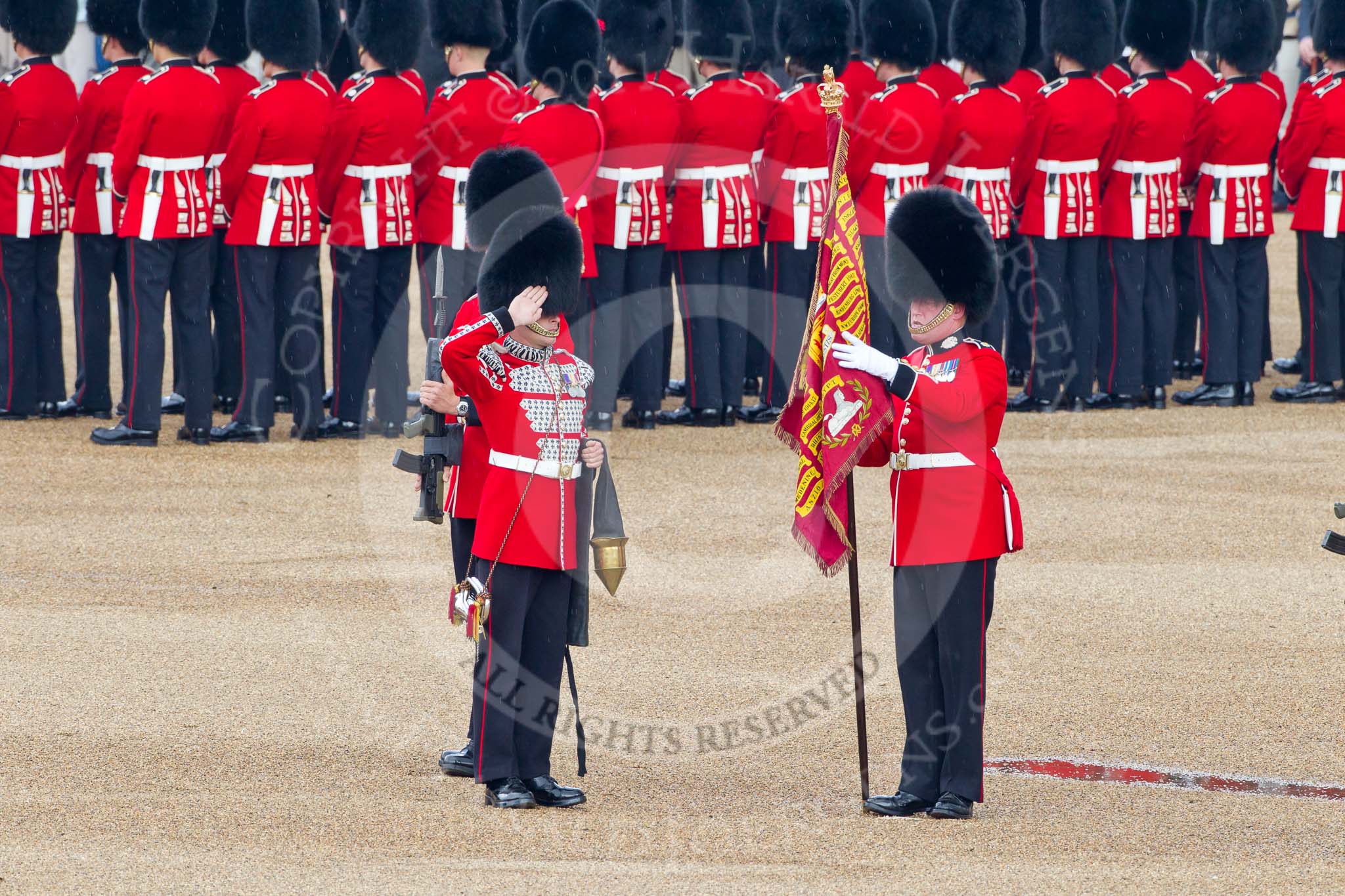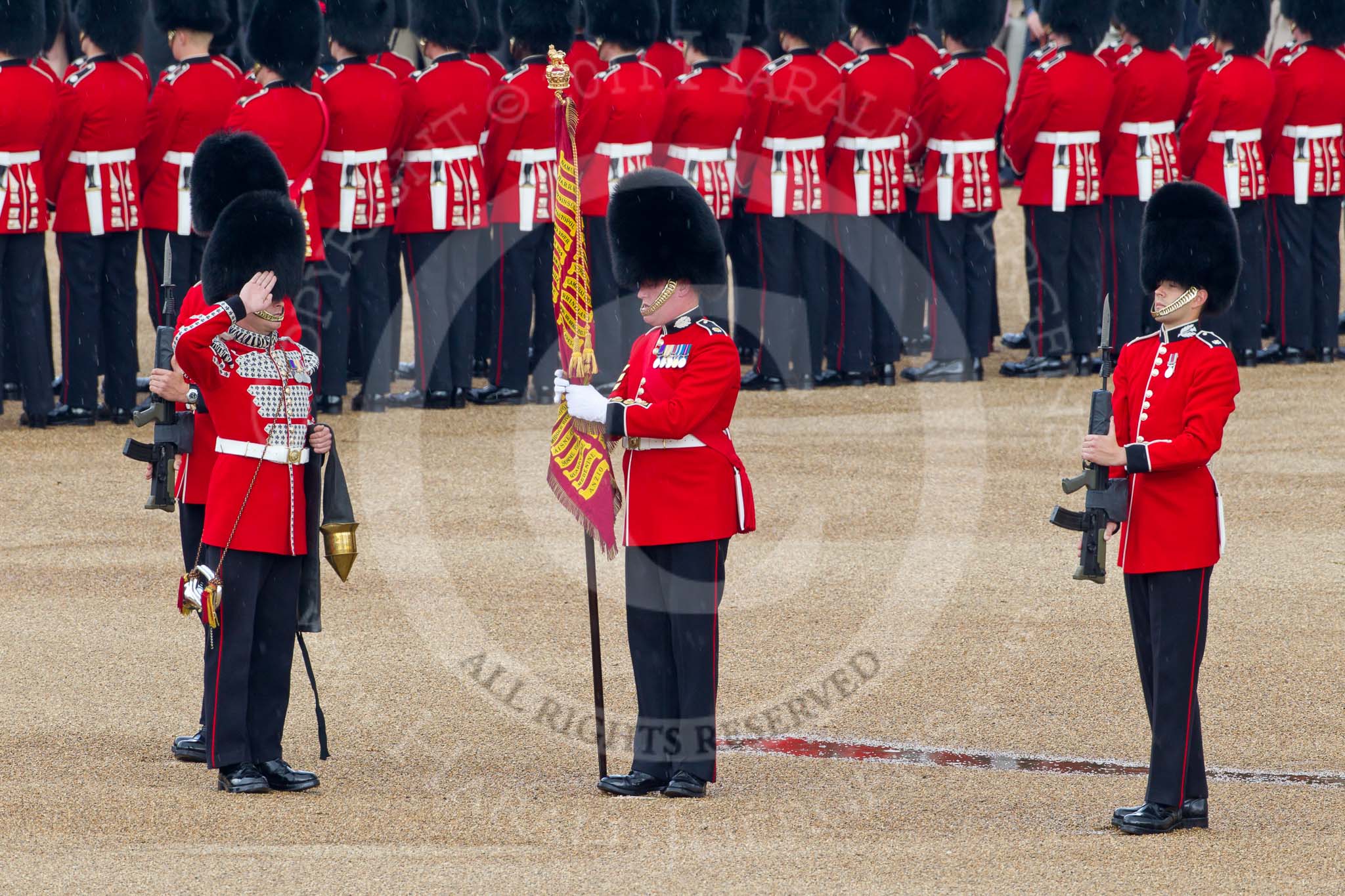 Trooping the Colour 2011: The Sergeant of the Ecort to the Colour, Colour Sergeant Chris Millin, holding the flag, whilst the two sentries present arms, and the Duty Drummer, holding the colour case, salutes.. Horse Guards Parade, Westminster, London SW1, Greater London, United Kingdom, on 11 June 2011 at 10:33, image #57