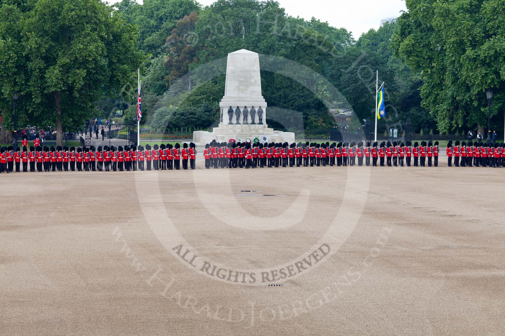 Trooping the Colour 2011: The Guards Memorial, with No. 2 Guard B Company Scots Guards, at the very left, followed, to the right, by No. 3 Guard (F Company Scots Guards), and No. 4 Guard (Nijmegen Company Grenadier Guards).. Horse Guards Parade, Westminster, London SW1, Greater London, United Kingdom, on 11 June 2011 at 10:36, image #60