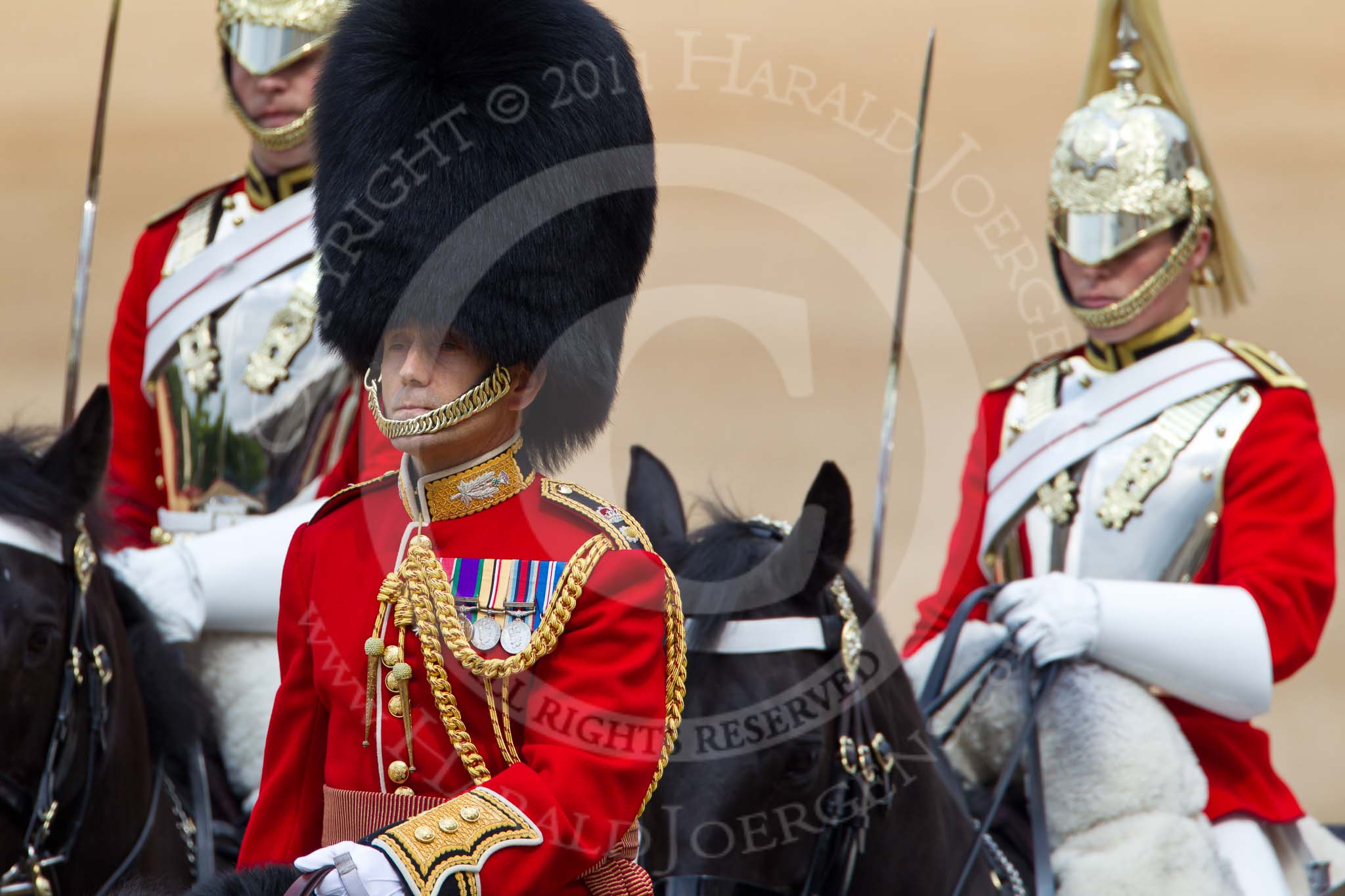 Trooping the Colour 2011: The Brigade Major Household Division, Lieutenant Colonel Andrew P Speed, Scots Guards, leading the way, followed by four Troopers of The Life Guards.. Horse Guards Parade, Westminster, London SW1, Greater London, United Kingdom, on 11 June 2011 at 10:57, image #106