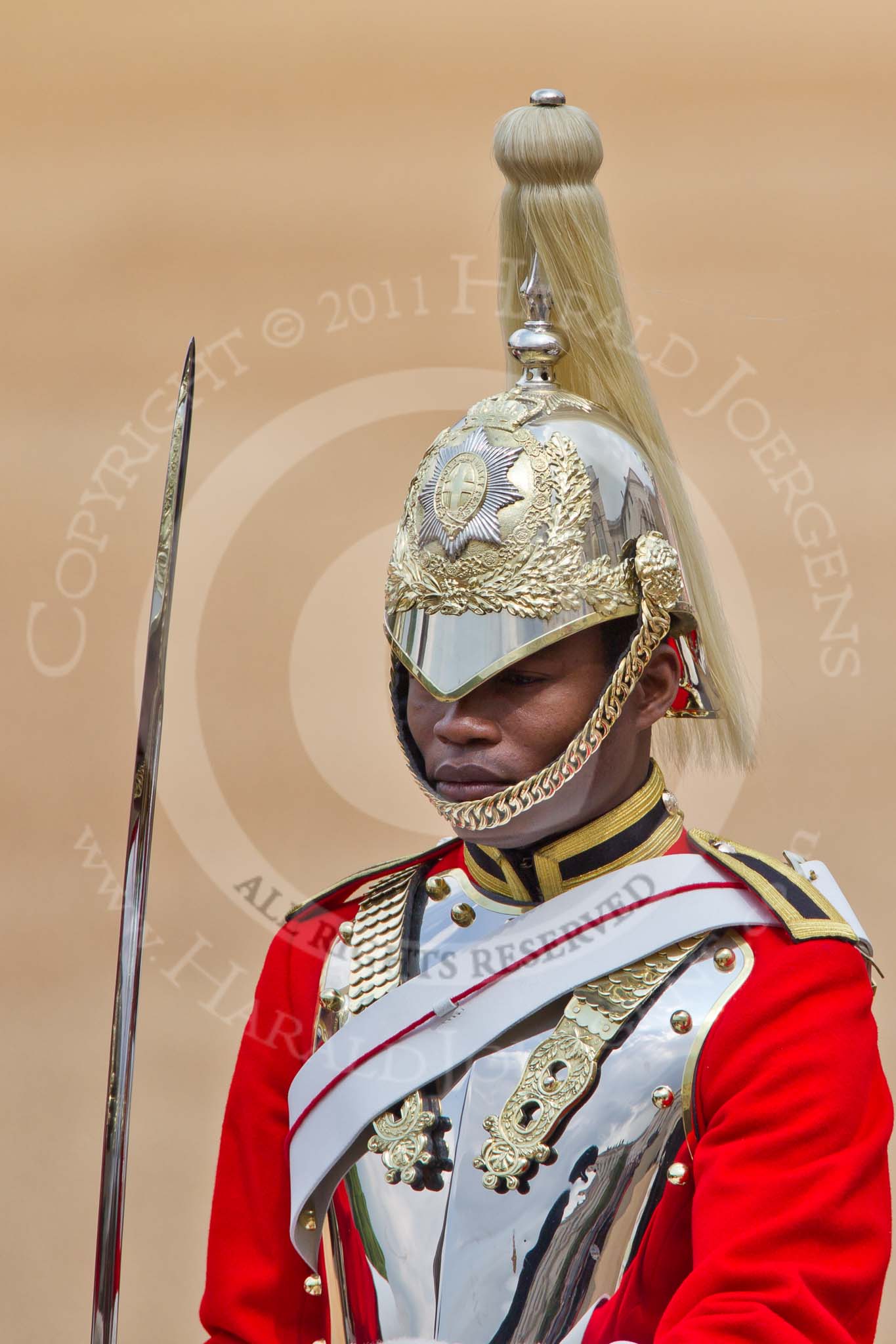 Trooping the Colour 2011: Close-up of one of the four Troopers of The Life Guards following the Brigade Major, leading the Royal Procession.. Horse Guards Parade, Westminster, London SW1, Greater London, United Kingdom, on 11 June 2011 at 10:57, image #107