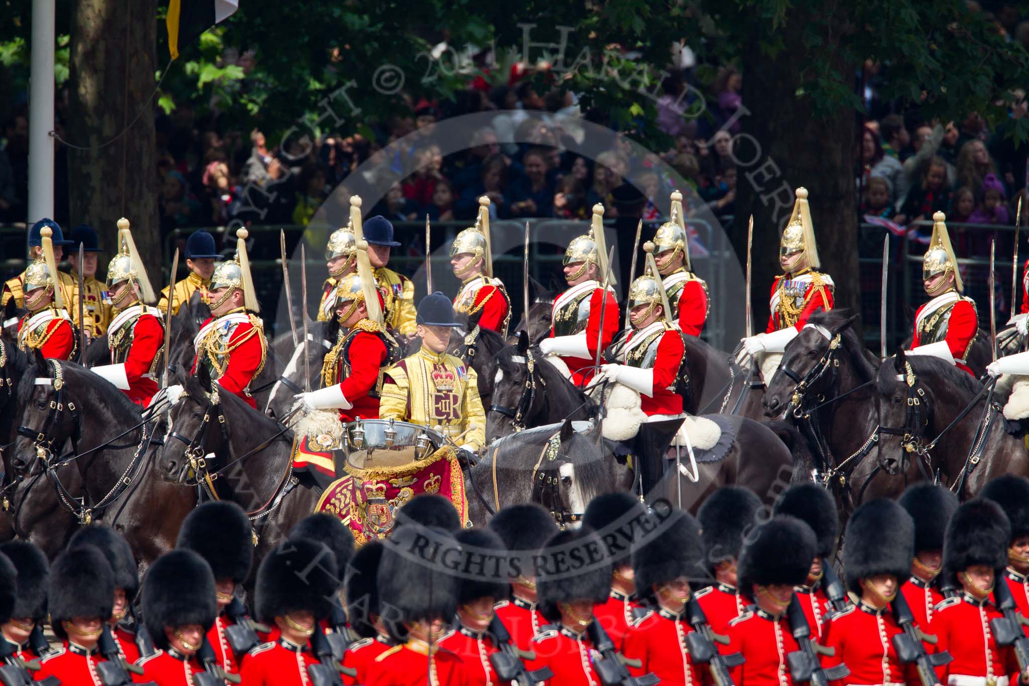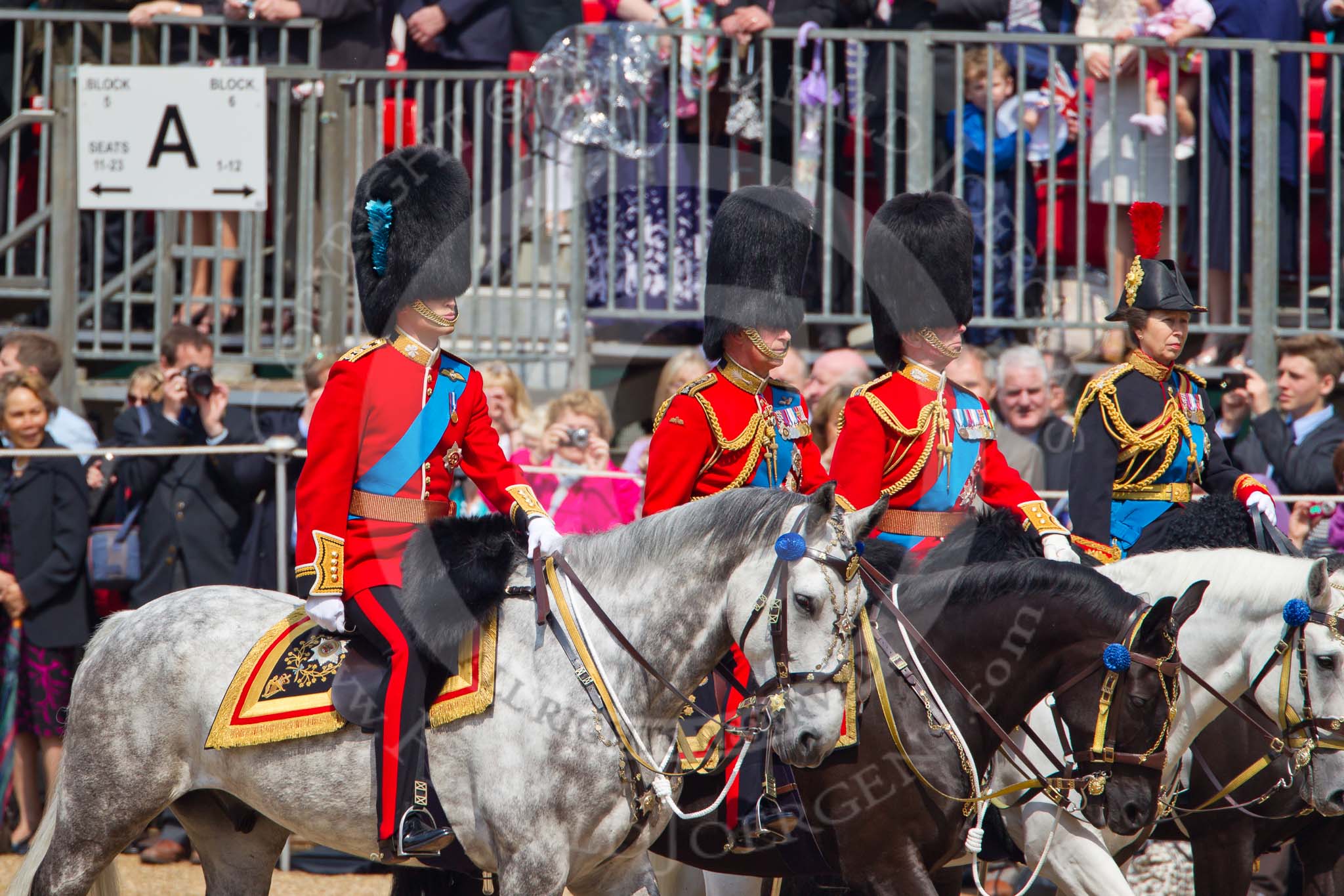 Trooping the Colour 2011: Following the ivory mounted phaeton, the four Royal Colonels arrive at Horse Guards Parade. From the left HRH Prince William, The Duke of Cambridge, HRH Prince Charles, The Prince of Wales, HRH Prince Edward, The Duke of Kent, and HRH Princess Anne, The Princess Royal. Behind the Prince of Wales the Field Officer of the Sovereign's Escort, Major Van Cutsem, The Life Guards. Just behind The Princess Royal is the Escort Commander, Captain A A Wallis, The Life Guards. These two are followed by by the Standard Party comprising of the Trumpeter, the Standard Bearer and the Standard Coverer.. Horse Guards Parade, Westminster, London SW1, Greater London, United Kingdom, on 11 June 2011 at 10:58, image #112