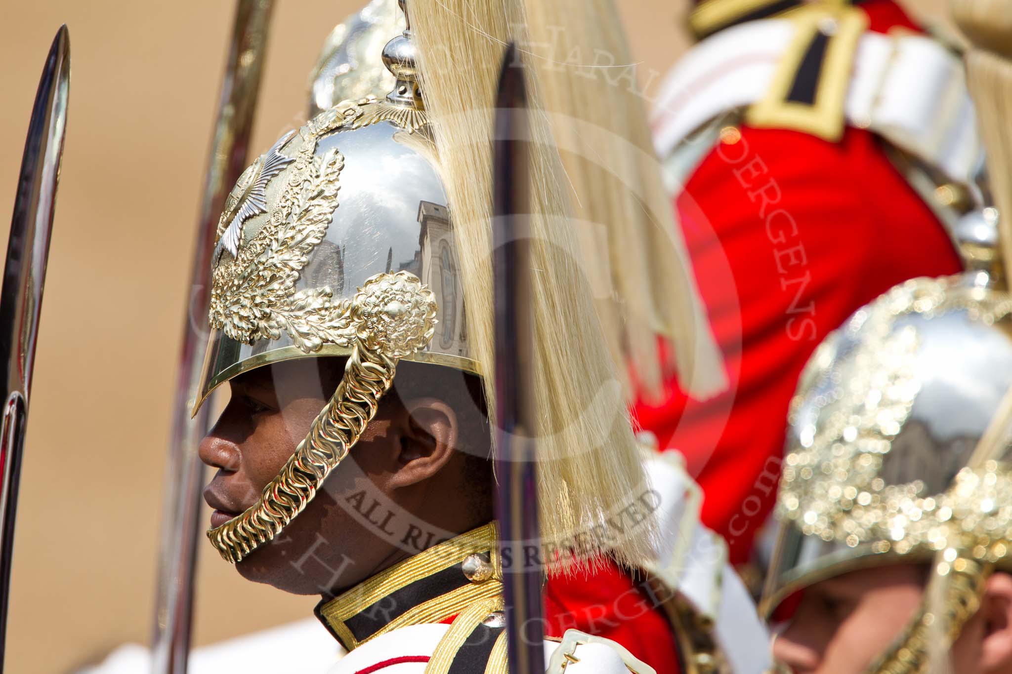 Trooping the Colour 2011: Close-up of a Trooper of the Life Guards following the Brigade Major, leading the Royal Procession. The reflection in the helmet shows Horse Guards Building.. Horse Guards Parade, Westminster, London SW1, Greater London, United Kingdom, on 11 June 2011 at 10:58, image #110