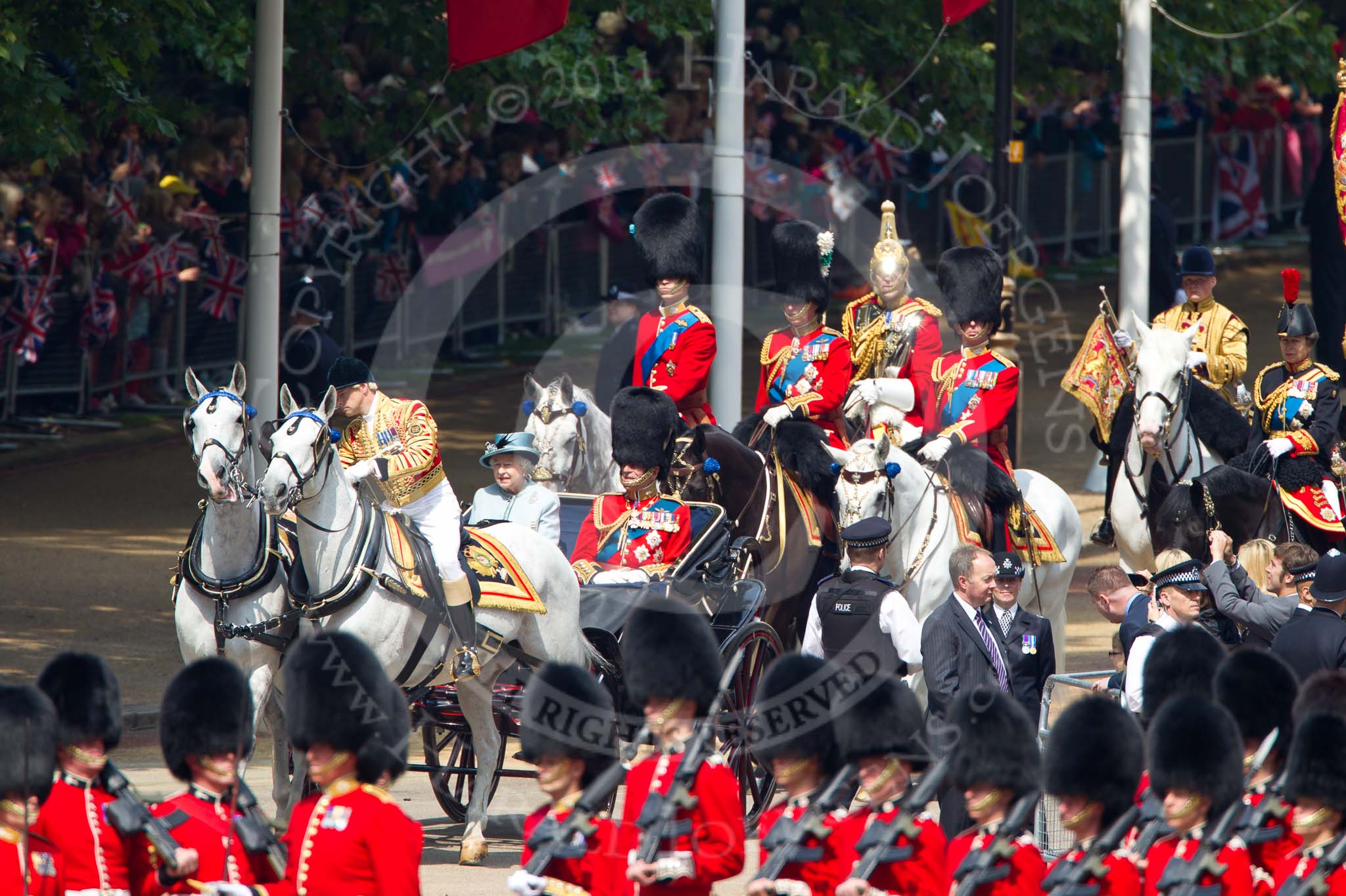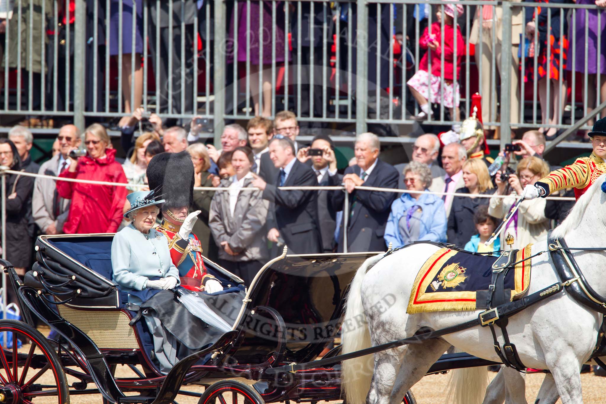Trooping the Colour 2011: Her Majesty The Queen and HRH Prince Philip, The Duke of Edinburgh, arriving at Horse Guards Parade in the ivory mounted phaeton, driven by head coachman Jack Hargreaves. Behind them are the four Royal Colonels, in this photo, at the very left, only HRH Princess Anne, The Princess Royal, is visible.. Horse Guards Parade, Westminster, London SW1, Greater London, United Kingdom, on 11 June 2011 at 10:58, image #114