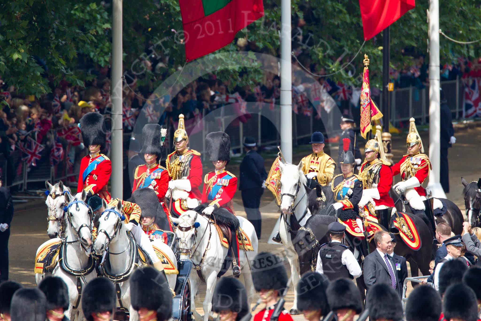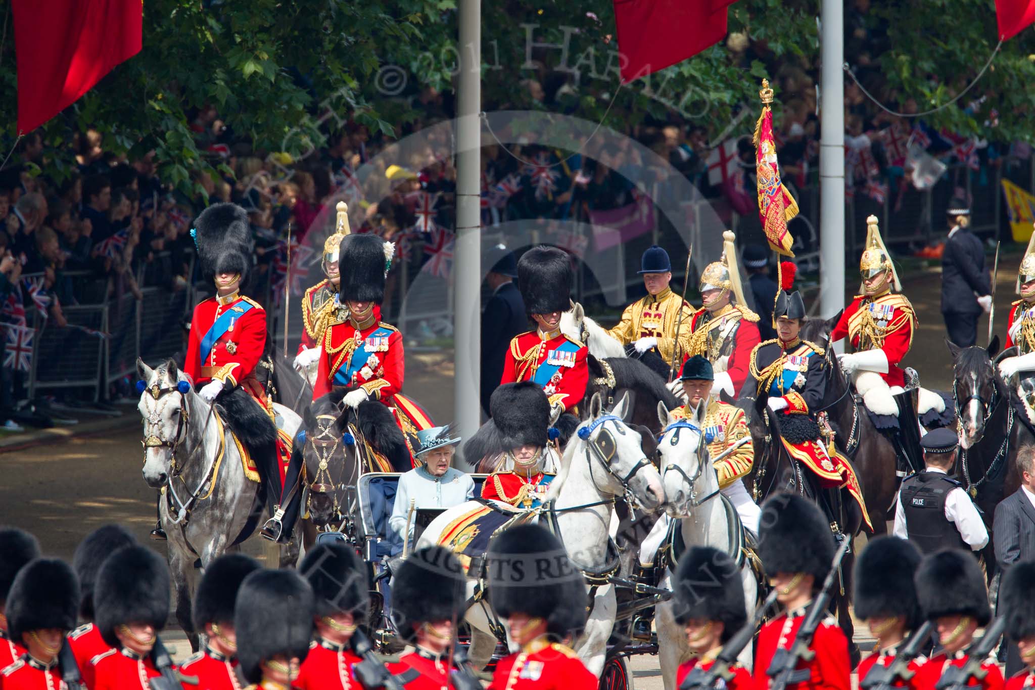 Trooping the Colour 2011: HM The Queen arriving at Horse Guards Parade for her Birthday Parade. Behind her the four Royal Colonels, from the left HRH Prince William, The Duke of Cambridge, HRH Prince Charles, The Prince of Wales, HRH Prince Edward, The Duke of Kent, and HRH Princess Anne, The Princess Royal.. Horse Guards Parade, Westminster, London SW1, Greater London, United Kingdom, on 11 June 2011 at 10:58, image #111