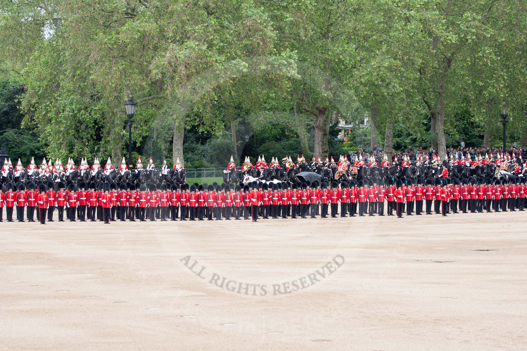 The Colonel's Review 2012: The Inspection of the Line continues behind No. 6 Guard towards the Souvereign's Escort, the Mounted Band of the Household Cavalry, and the King's Troop Royal Horse Artillery, all in position along the St James's Park side of Horse Guards Parade.. Horse Guards Parade, Westminster, London SW1, United Kingdom, on 09 June 2012 at 11:02, image #185