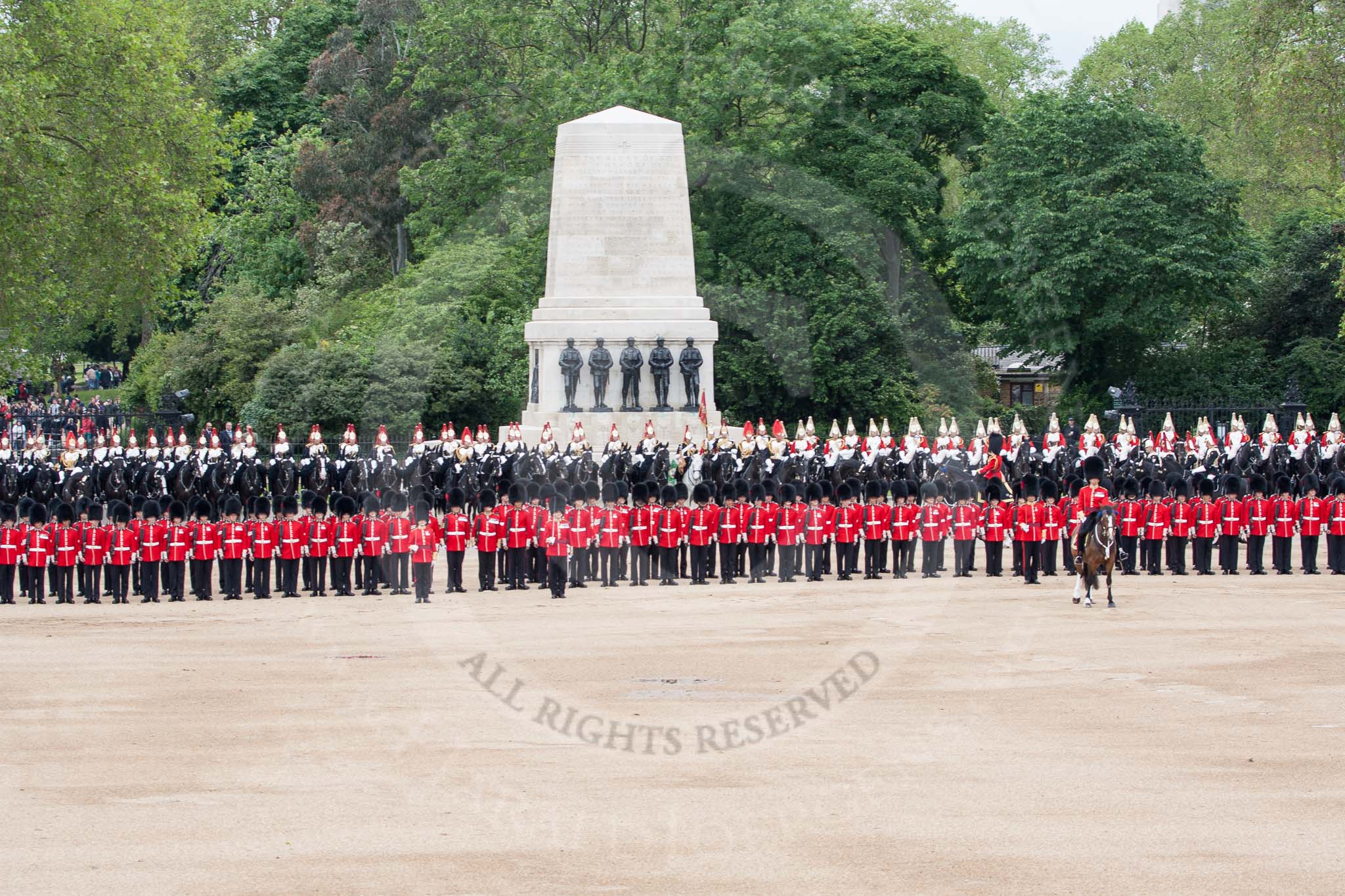 The Colonel's Review 2012: The Inspection of the Line continues behind No. 6 Guard towards the Souvereign's Escort, the Mounted Band of the Household Cavalry, and the King's Troop Royal Horse Artillery, all in position along the St James's Park side of Horse Guards Parade, here in front of the Guards Memorial.. Horse Guards Parade, Westminster, London SW1, United Kingdom, on 09 June 2012 at 11:02, image #187