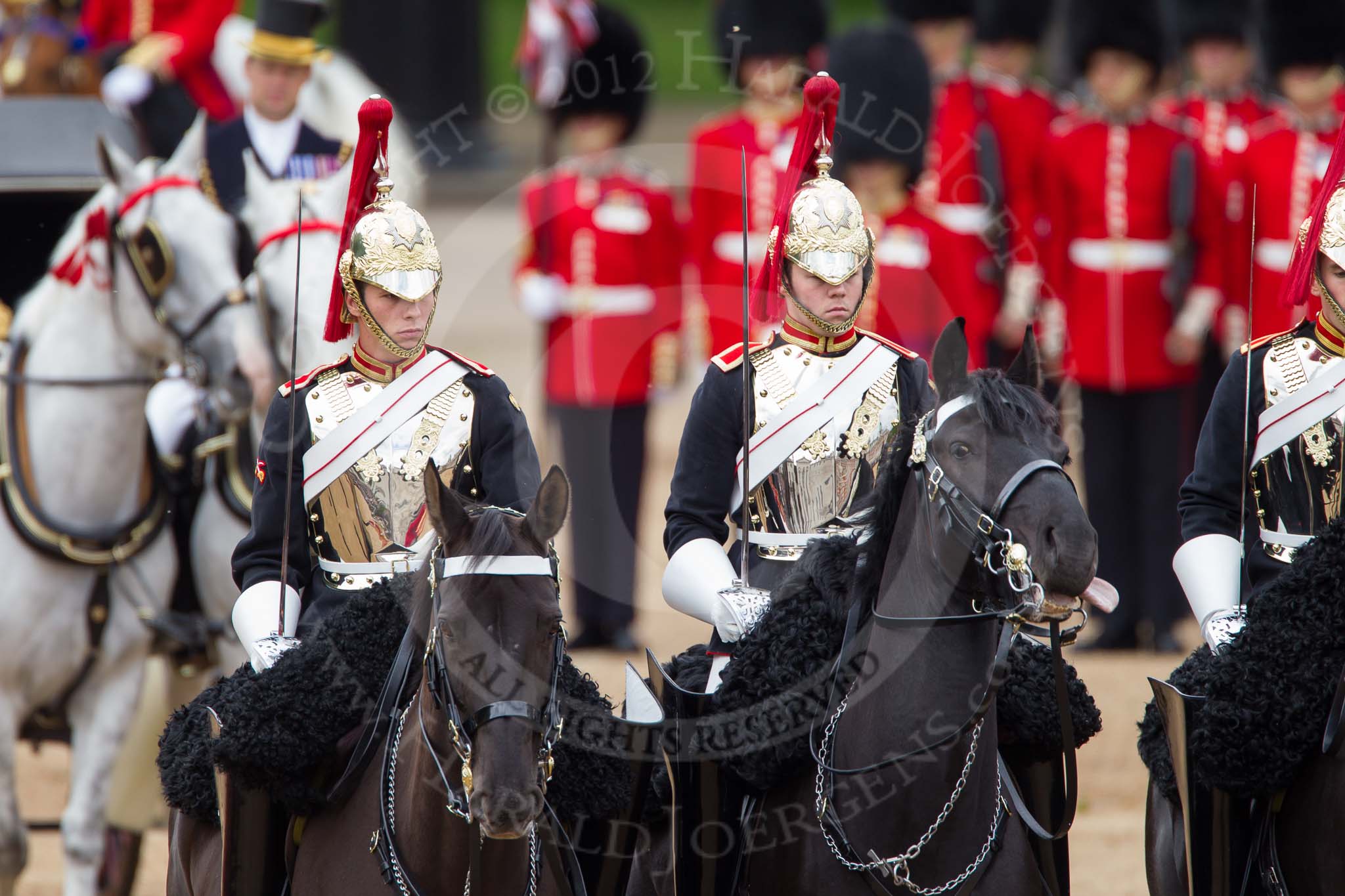 The Colonel's Review 2012: After the Inspection of the Line: The four Troopers from The Blues and Royals, followed by the carriage with the two Windor Grey horses.. Horse Guards Parade, Westminster, London SW1, United Kingdom, on 09 June 2012 at 11:04, image #190