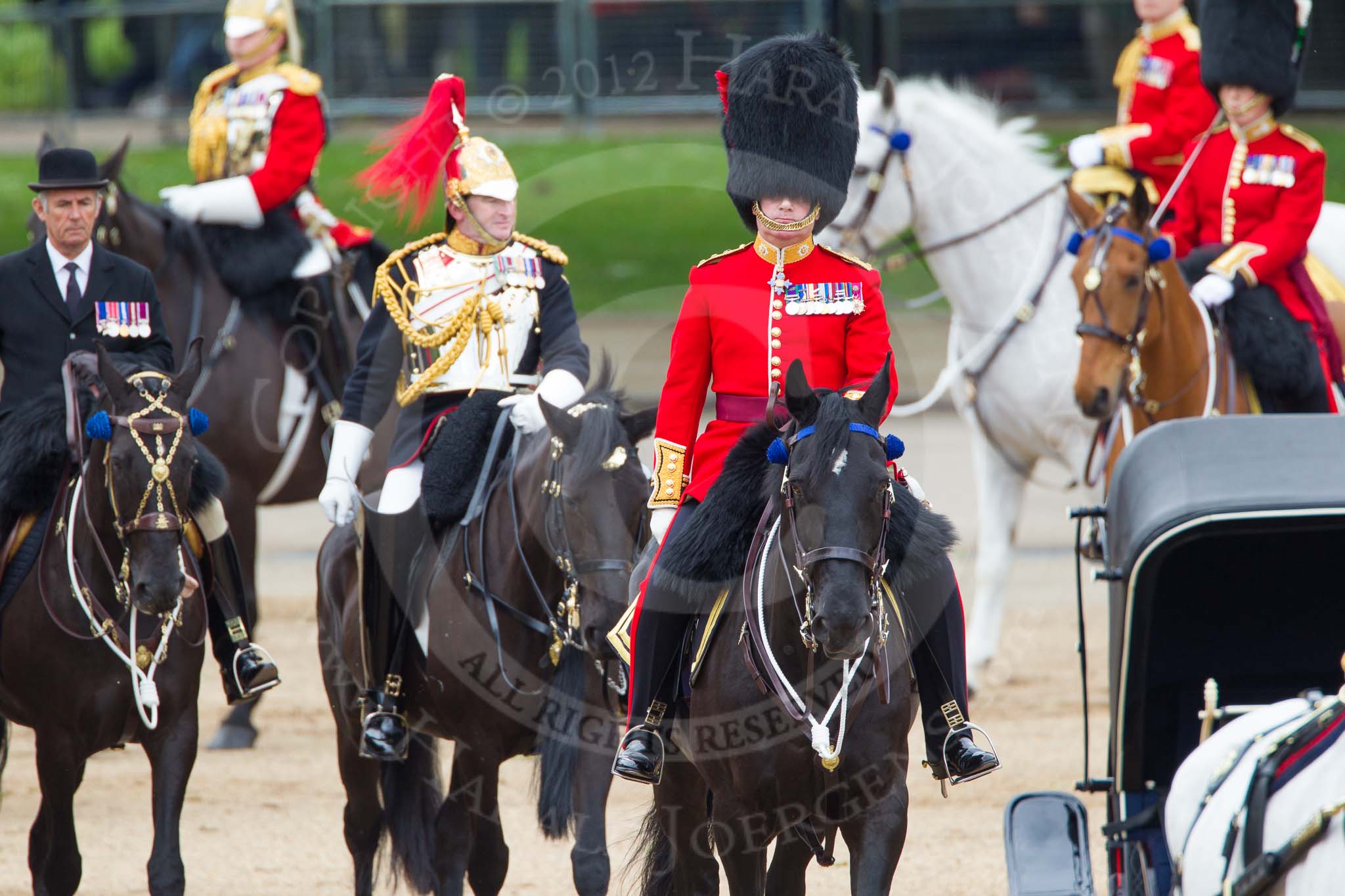 The Colonel's Review 2012: From right to left: Aide-de-Camp Captain F A O Kuku, Grenadier Guards, Chief of Staff Colonel R H W St G Bodington, Welsh Guards, Silver-Stick-in-Waiting, Colonel S H Cowen, The Blues and Royals (Royal Horse Guards and 1st Dragoons).. Horse Guards Parade, Westminster, London SW1, United Kingdom, on 09 June 2012 at 11:04, image #195