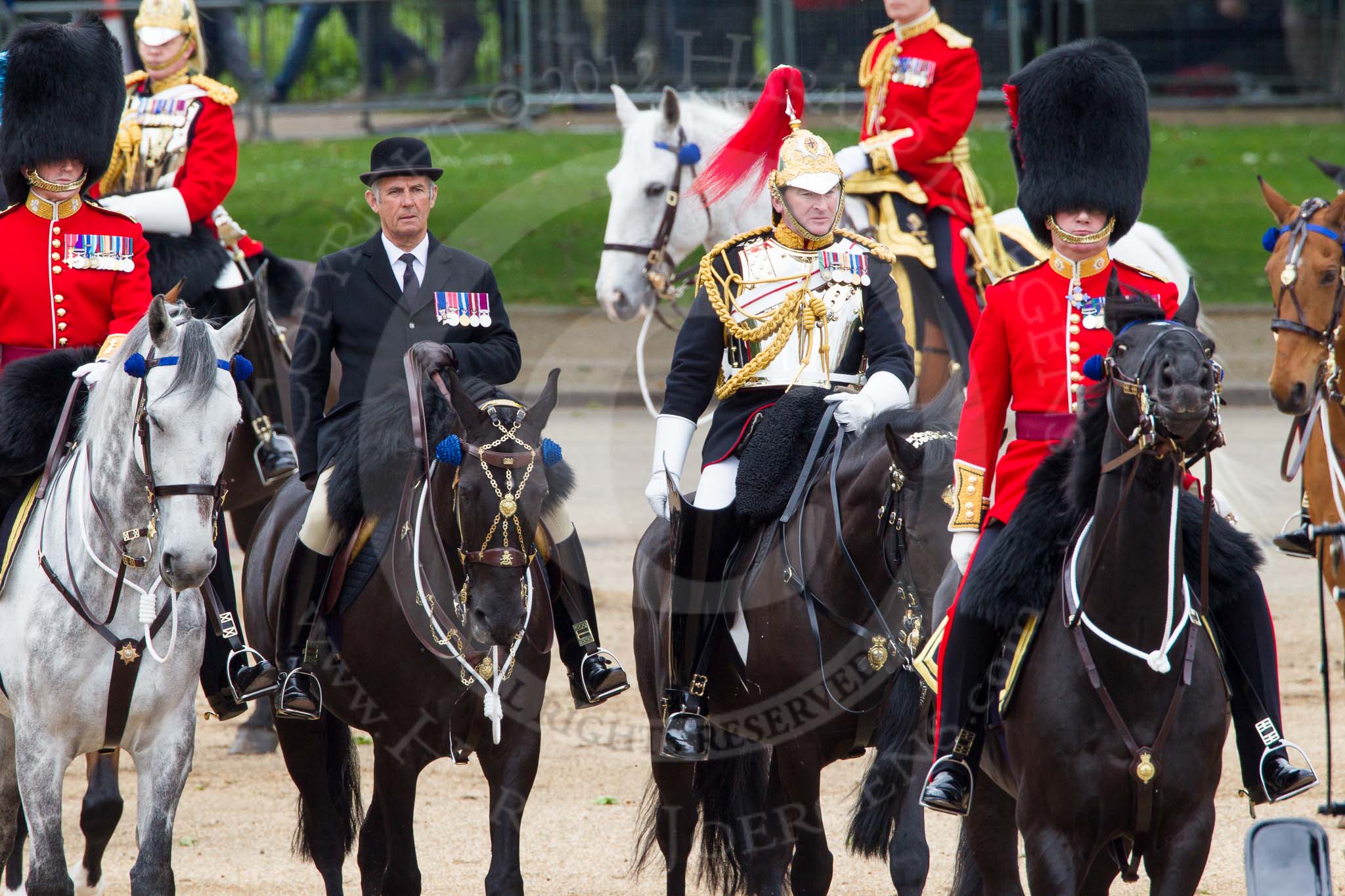 The Colonel's Review 2012: In position on the Western side of Horse Guards Parade: The four Troopers from The Life Guards trailing the Royal Procession, two Grooms from the Royal Household, and Lieutenant Colonel H S J Scott, Major G V A Baker, Lieutenant Colonel A W Foster, Colonel T C S Bonas, Lieutenant Colonel J B O’Gorman and Major E M Crofton.. Horse Guards Parade, Westminster, London SW1, United Kingdom, on 09 June 2012 at 11:03, image #188