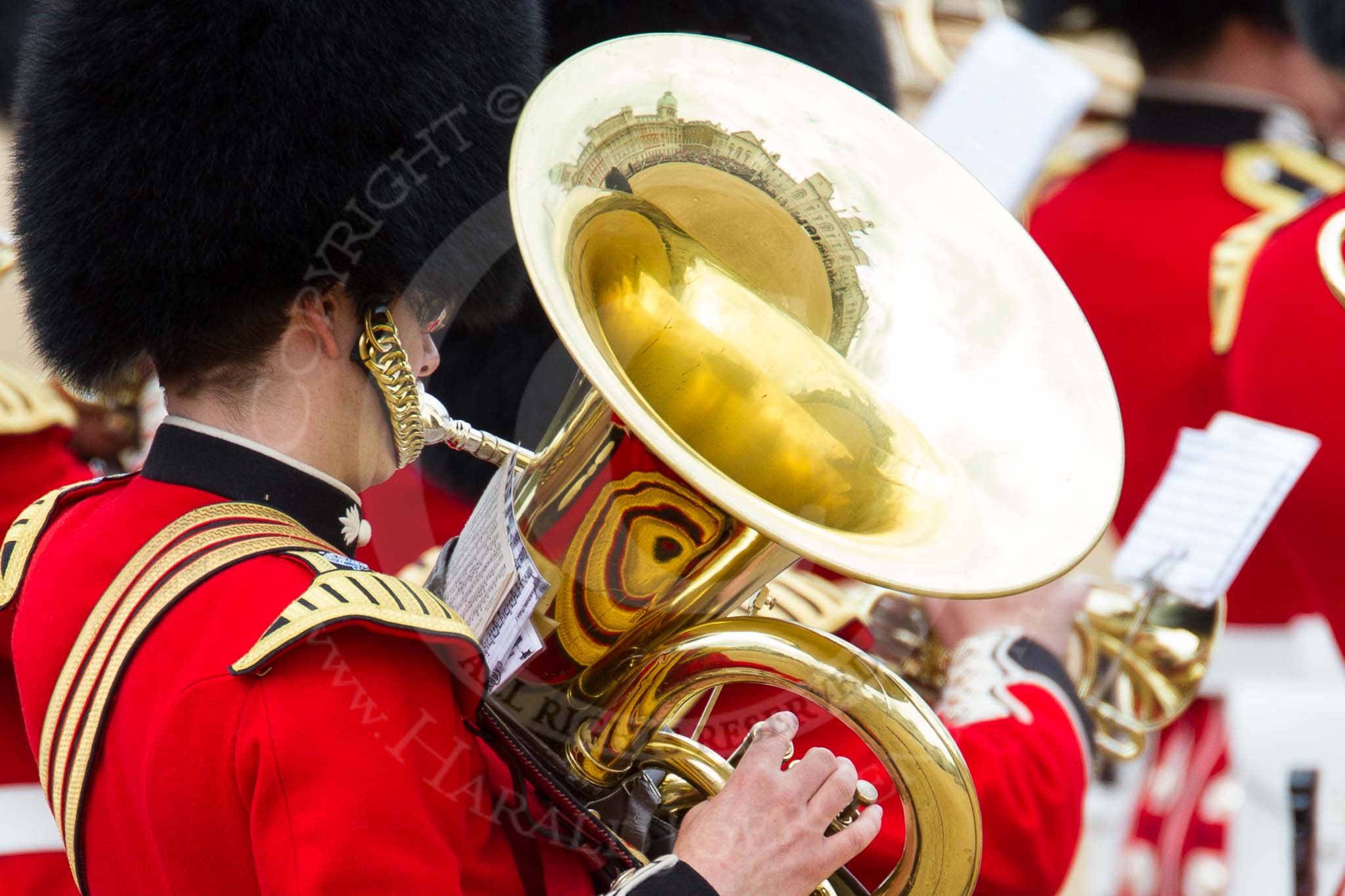 The Colonel's Review 2012: The reflection in the instrument is, again, the point in this image.. Horse Guards Parade, Westminster, London SW1, United Kingdom, on 09 June 2012 at 11:11, image #241