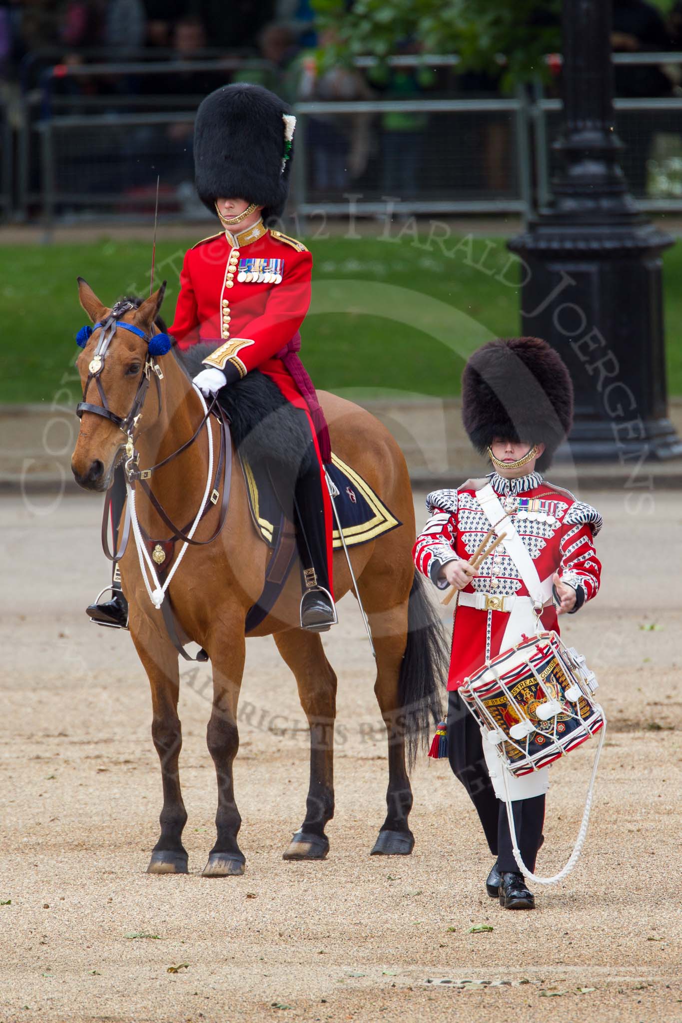 The Colonel's Review 2012: The Major of the Parade, Major Mark Lewis, Welsh Guards, and the "lone drummer" that is about to start the next phase of the parade.. Horse Guards Parade, Westminster, London SW1, United Kingdom, on 09 June 2012 at 11:12, image #244