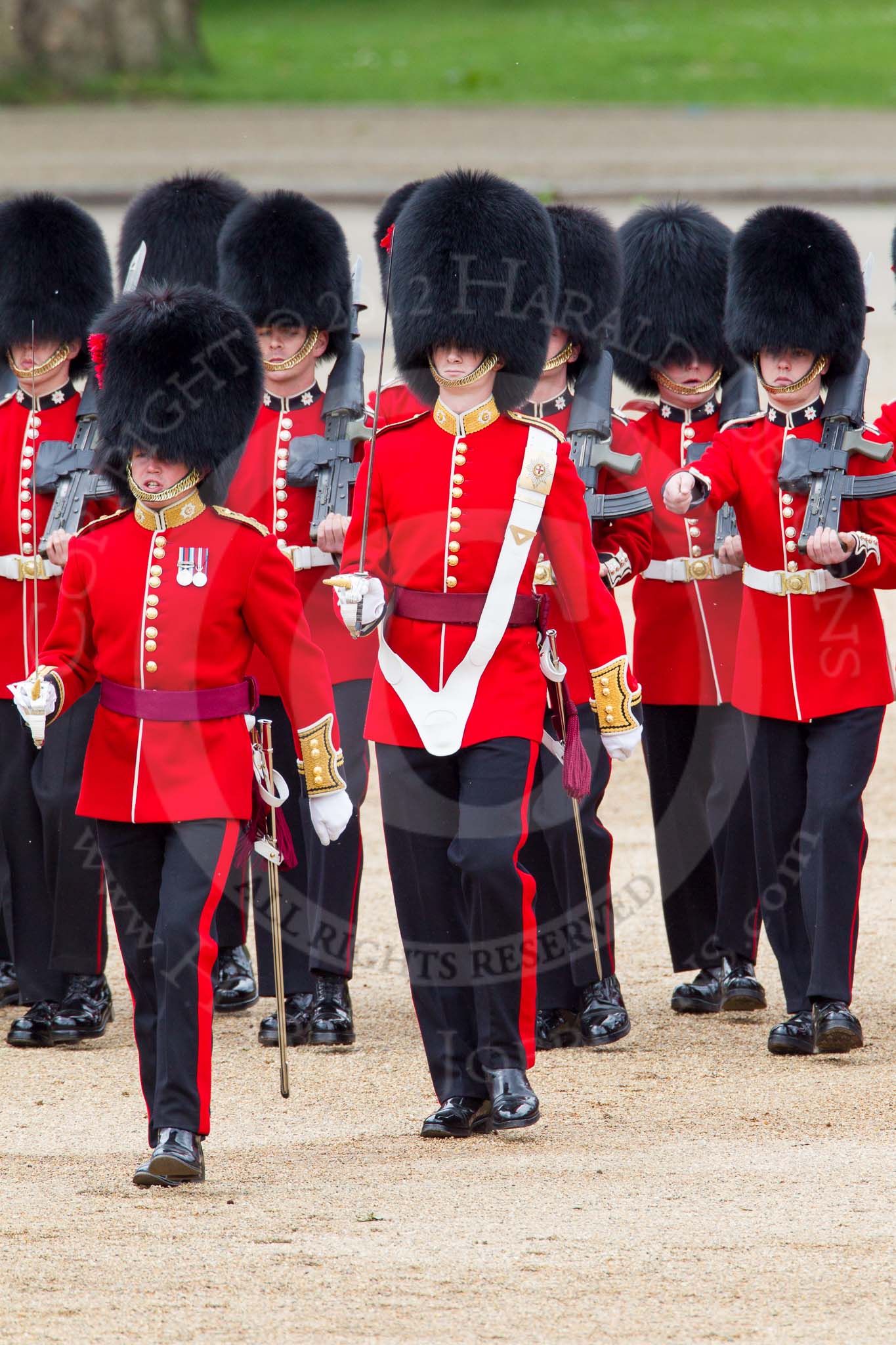 The Colonel's Review 2012: No. 1 Guard (Escort for the Colour), 1st Battalion Coldstream Guards, in front Captain R M Crook and the Ensign, wearing the white colour belt.. Horse Guards Parade, Westminster, London SW1, United Kingdom, on 09 June 2012 at 11:13, image #248