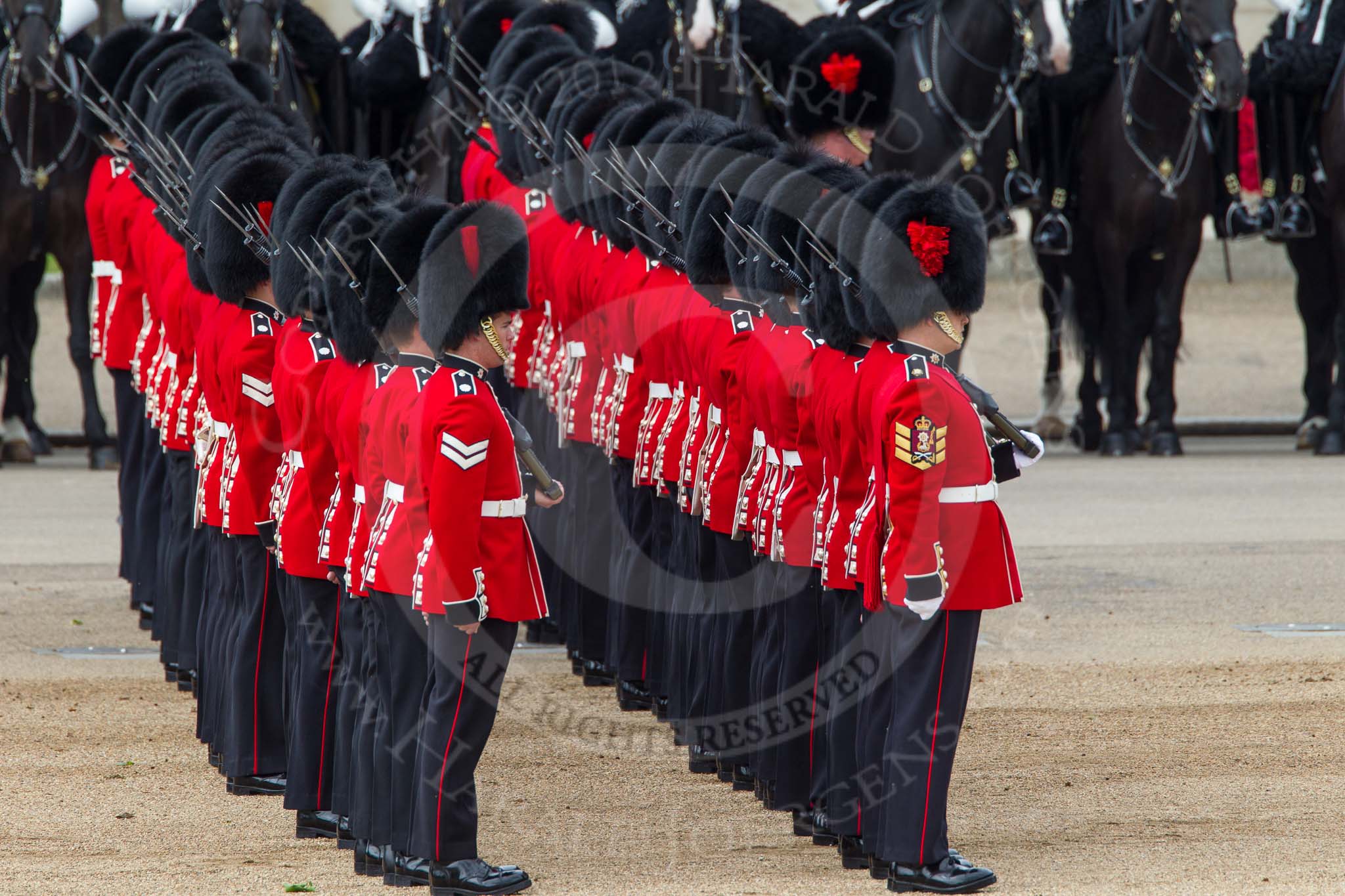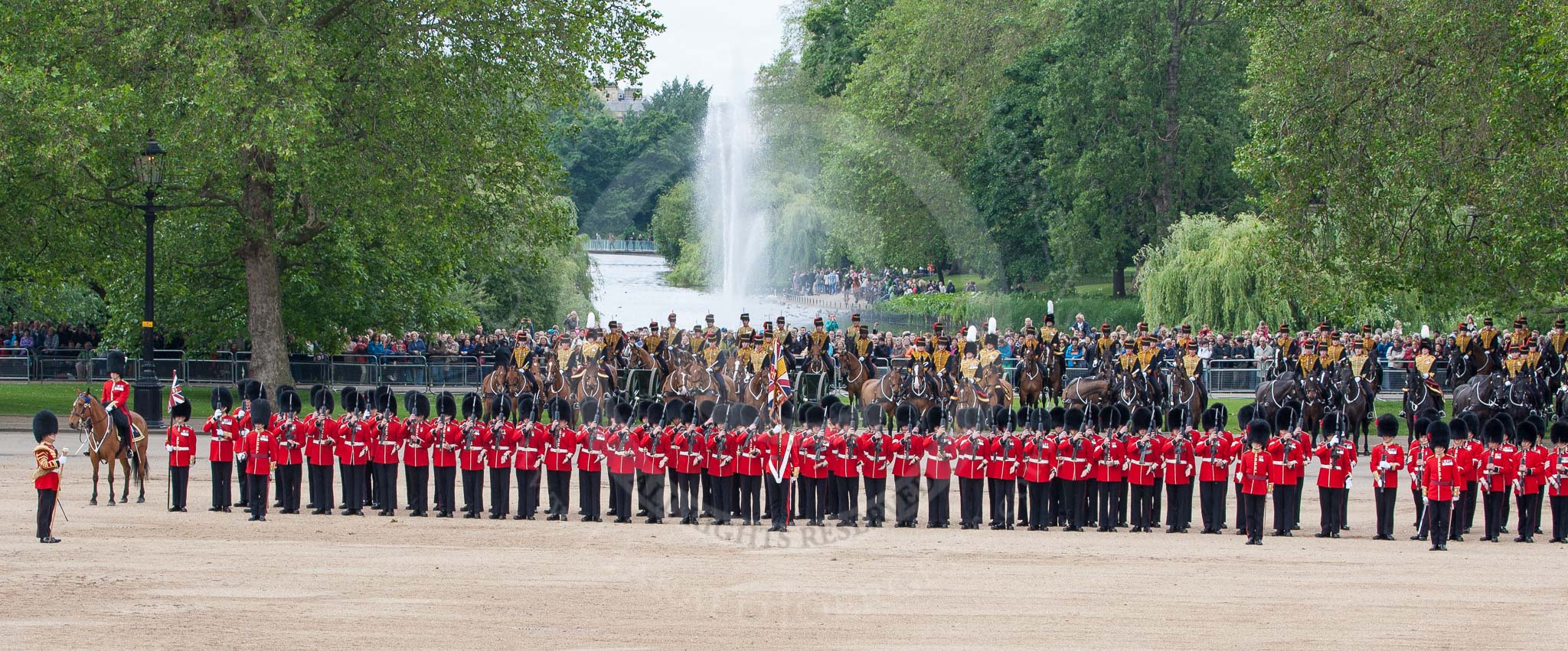The Colonel's Review 2012: The line of guardsmen on the St James's Park side of Horse Guards Parade, behind them The Life Guards and the Blues and Royals. On the left the Guards Memorial..
