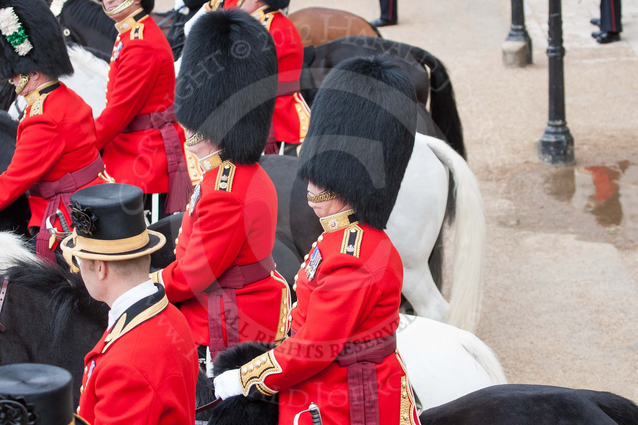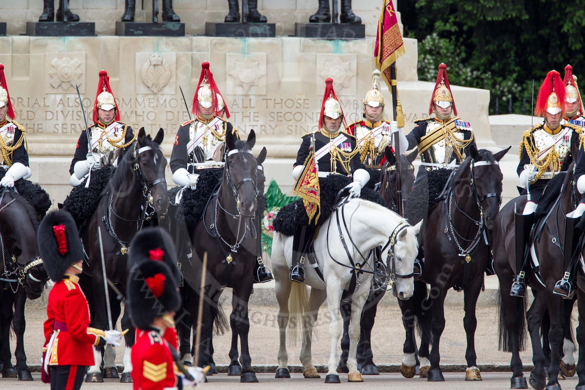 The Colonel's Review 2012: Standard Coverer, Standard Bearer, Trumpeter, and members of The Blues and Royals in front of the Guards Memorial..