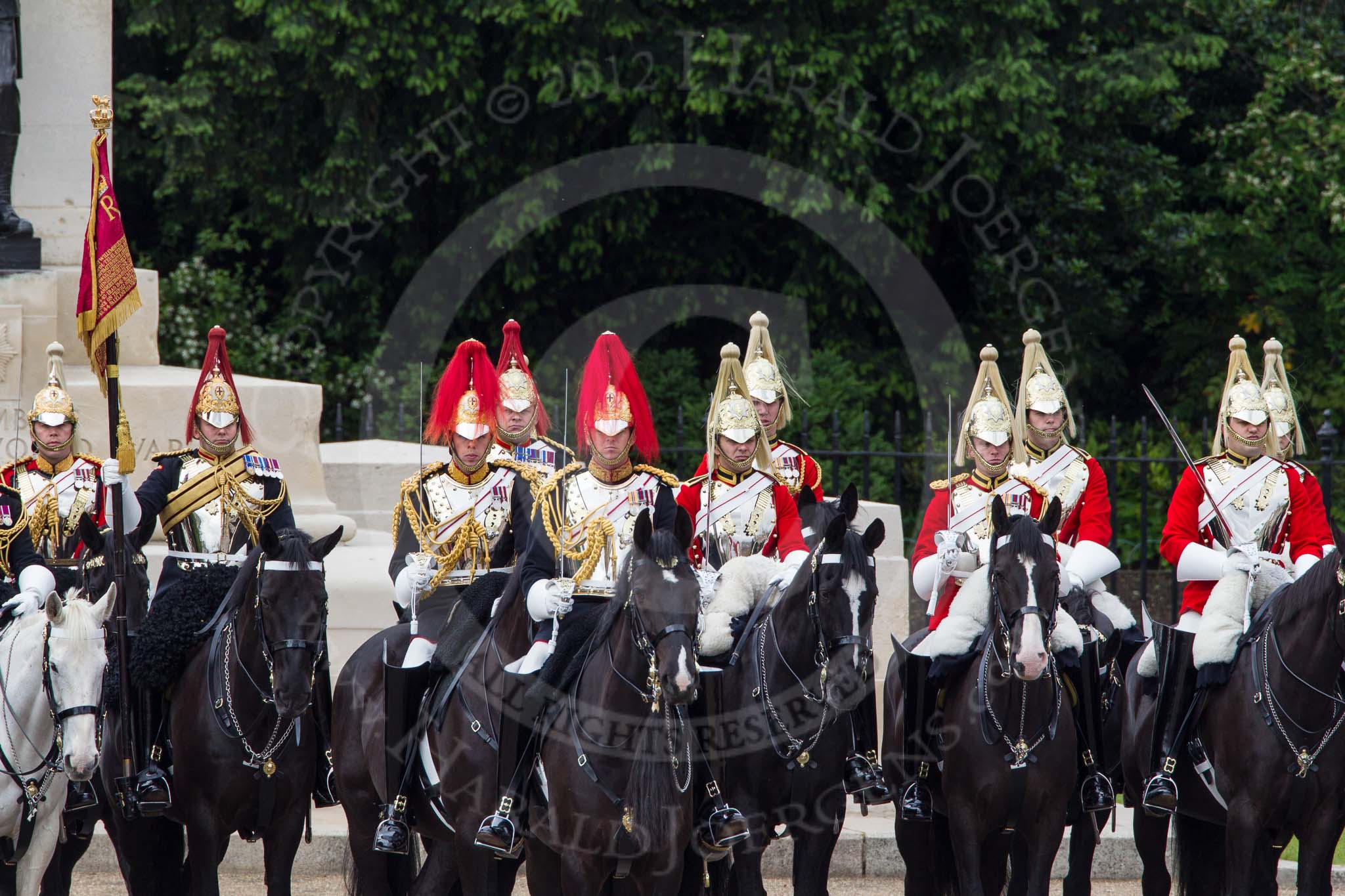 The Colonel's Review 2012: The Blues and Royals, and The Life Guards, at the St James's' Park sie of Horse Guards Parade, next to the Guards Memorial.. Horse Guards Parade, Westminster, London SW1, United Kingdom, on 09 June 2012 at 11:28, image #301