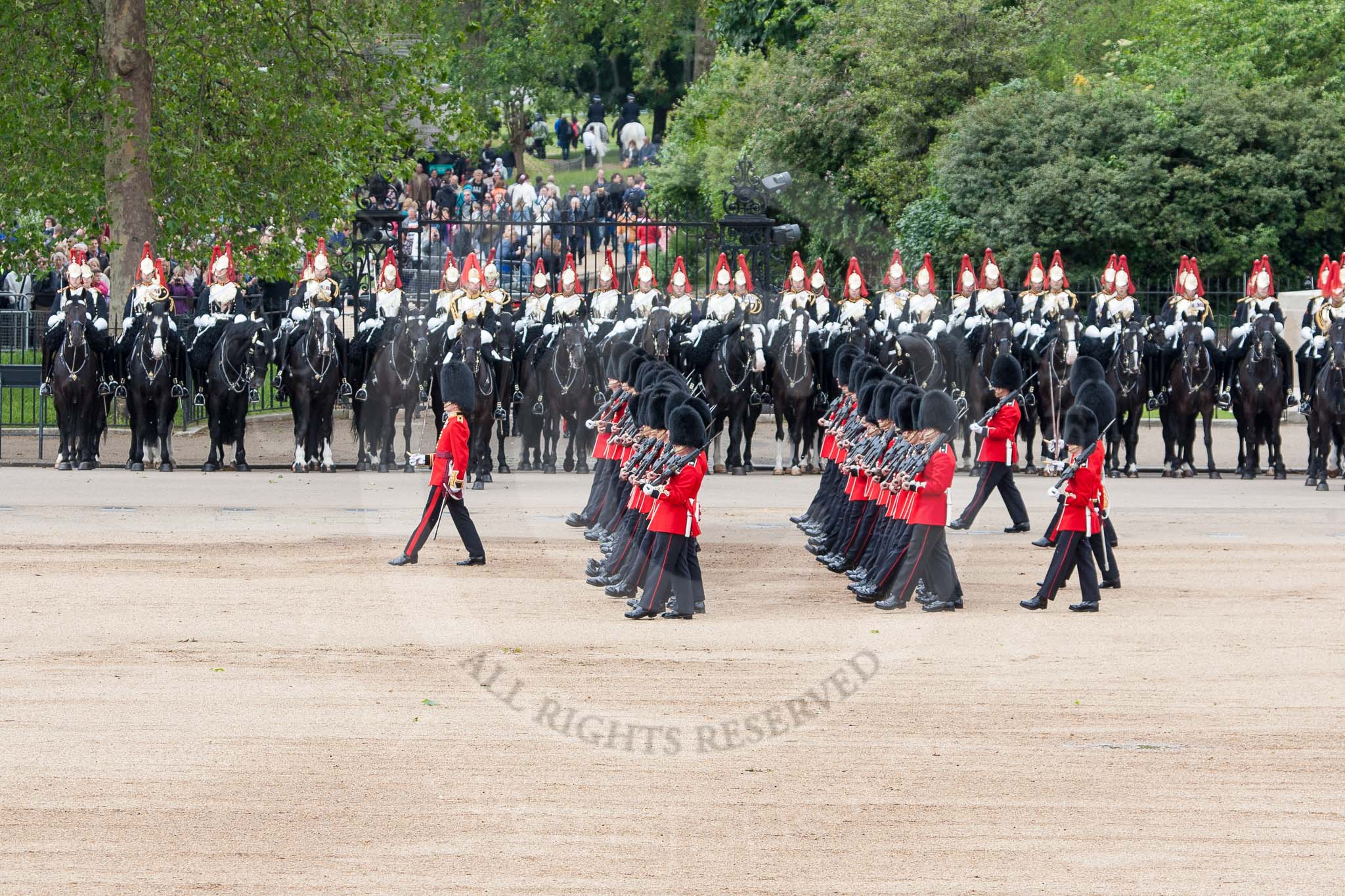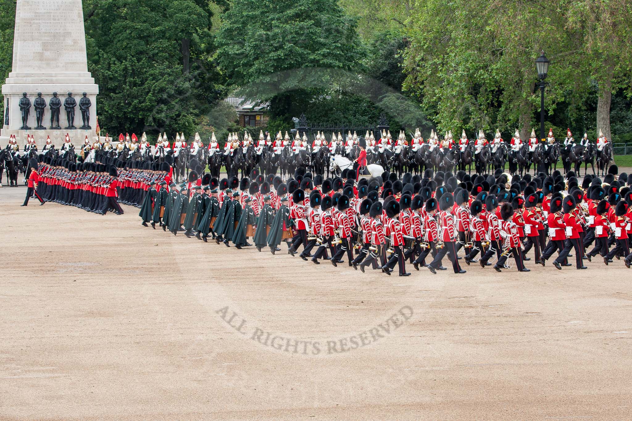The Colonel's Review 2012: Foot Guards marching along the lines of Blues and Royals, on the St James's Park side of Horse Guards Parade.. Horse Guards Parade, Westminster, London SW1, United Kingdom, on 09 June 2012 at 11:30, image #308