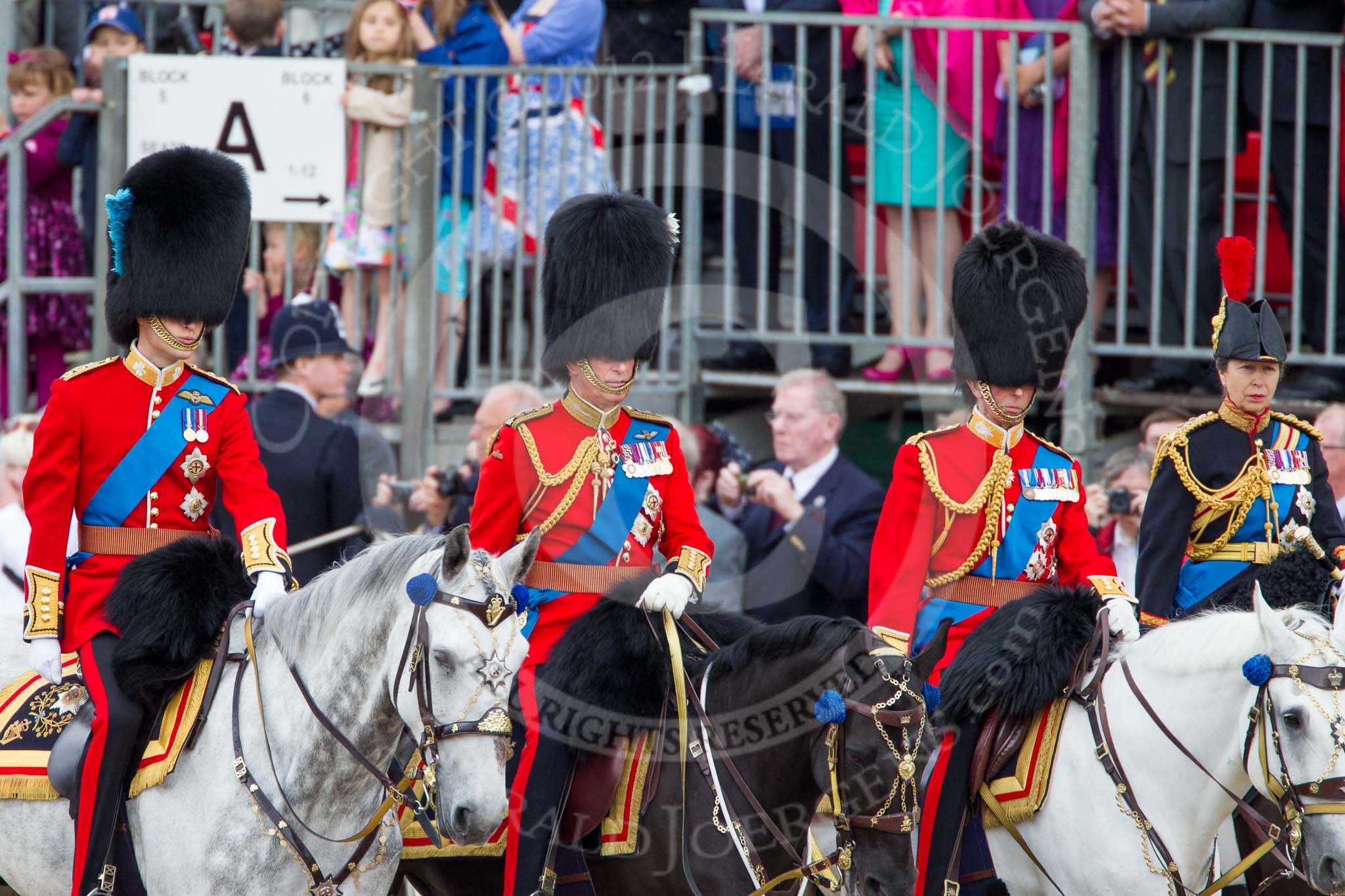 Trooping the Colour 2012: The Royal Colonels: HRH The Duke of Cambridge, Colonel Irish Guards, HRH The Prince of Wales, Colonel Welsh Guards, HRH The Duke of Kent, Colonel Scots Guards, and HRH The Princess Royal, Gold Stick in Waiting and Colonel The Blues and Royals (Royal Horse Guards and 1st Dragoons).. Horse Guards Parade, Westminster, London SW1, United Kingdom, on 16 June 2012 at 10:58, image #161