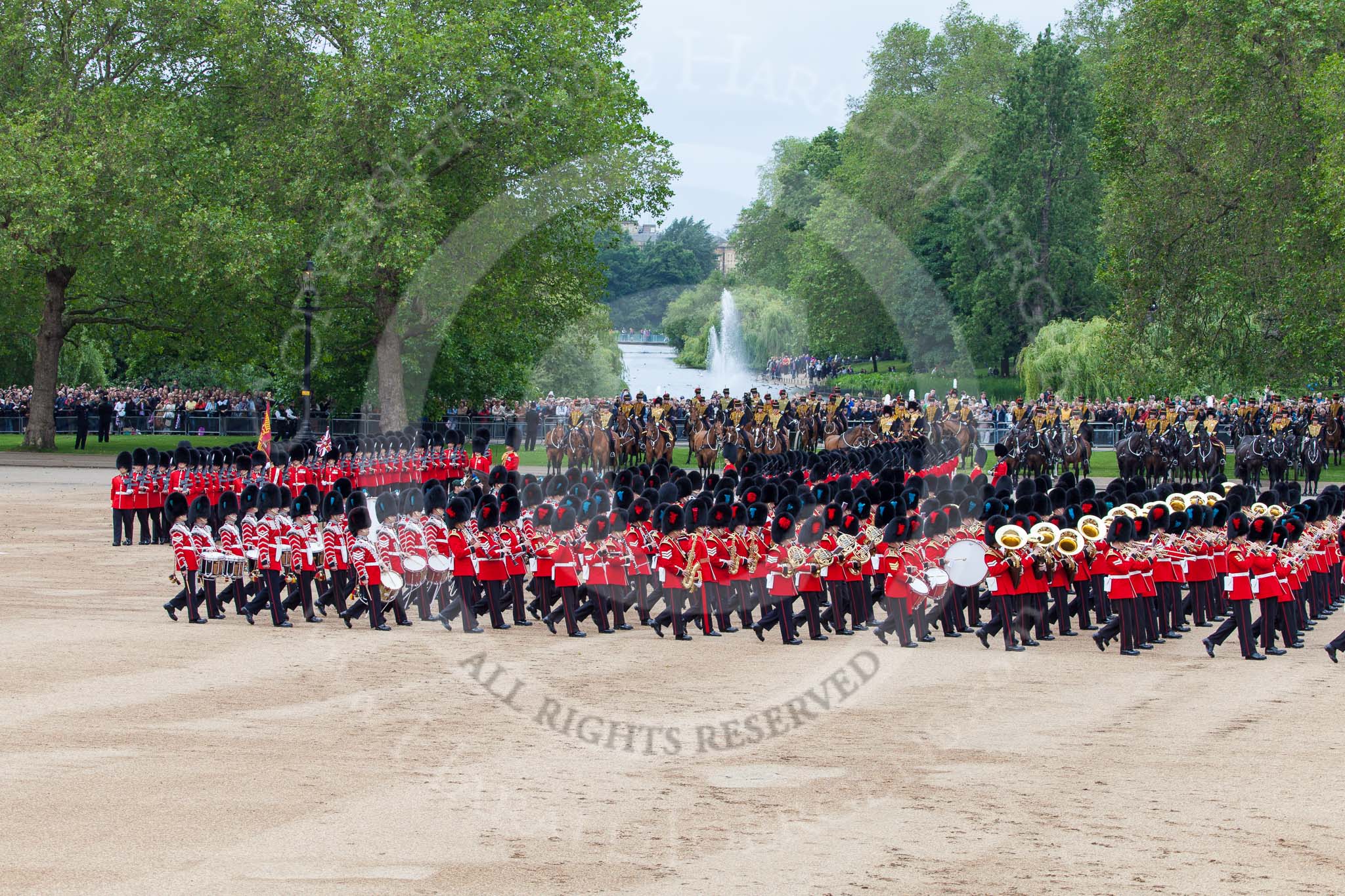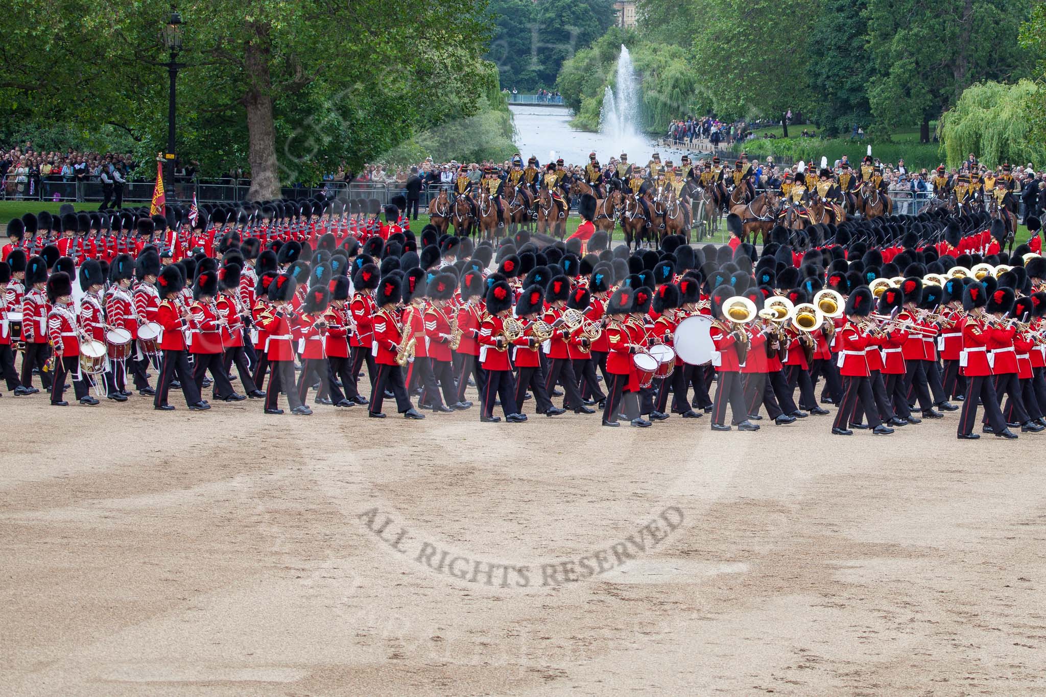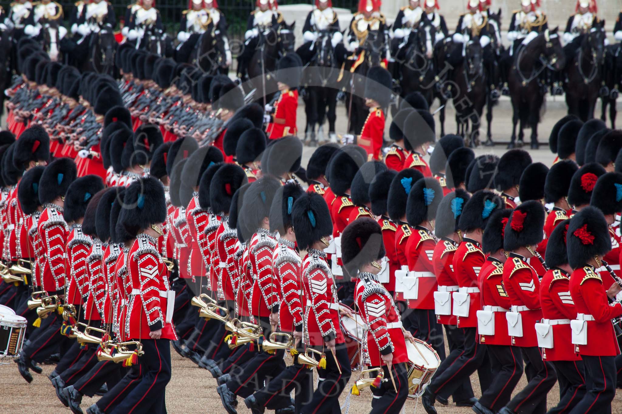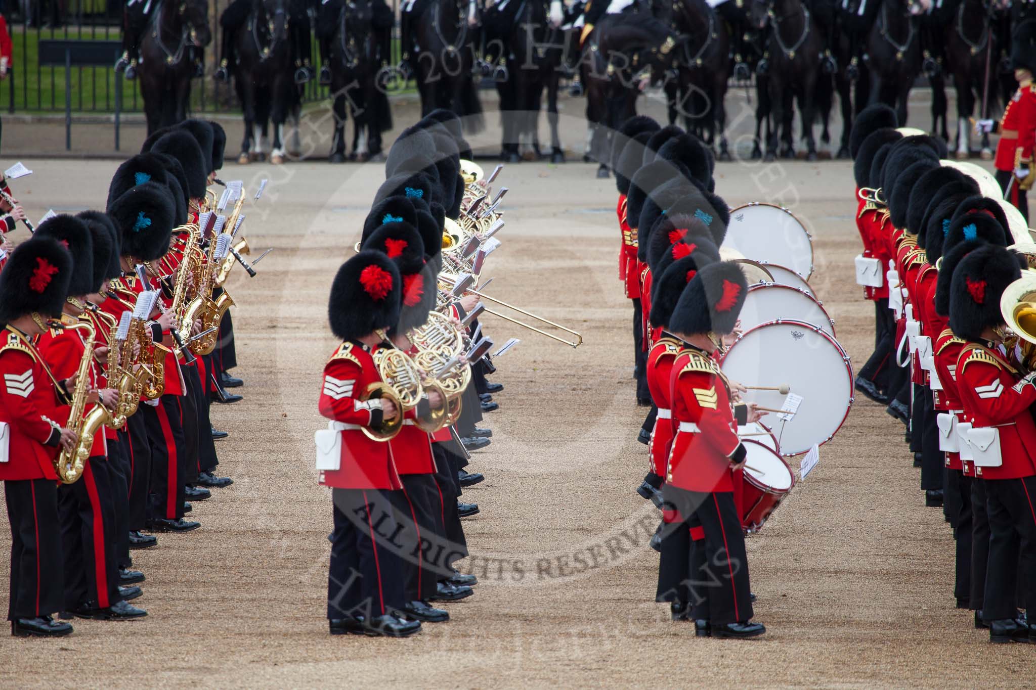 Trooping the Colour 2012: The Massed bands during the March Past. The bands are marching to the right, and the guards divisions, between the bands and the cavalry in this image, are marching to the left, surrounding Horse Guards Parade anti-clockwise.. Horse Guards Parade, Westminster, London SW1, United Kingdom, on 16 June 2012 at 11:33, image #384